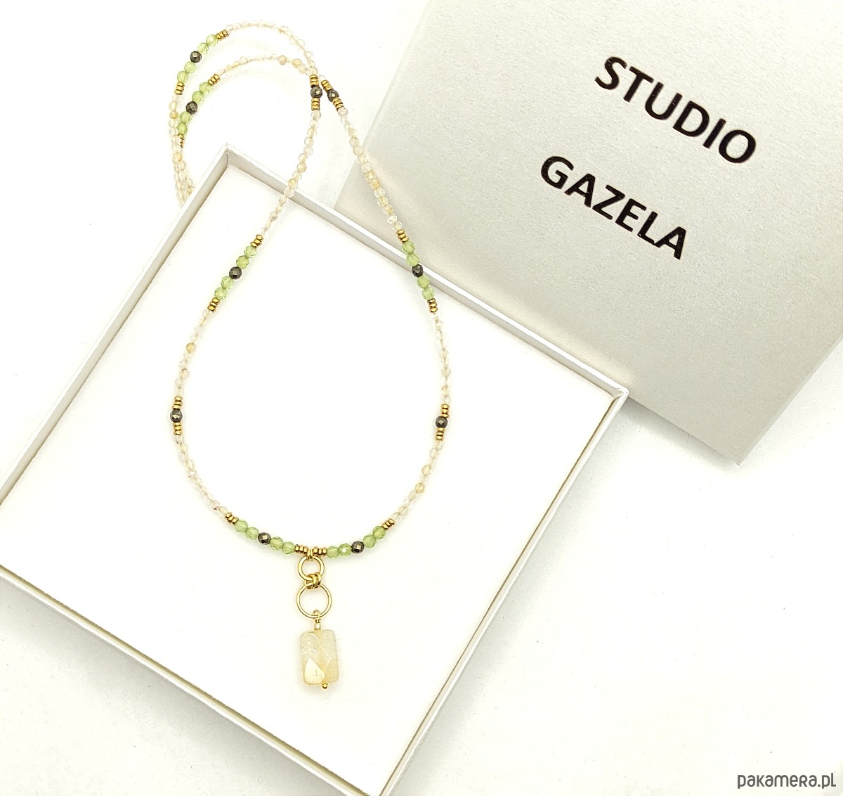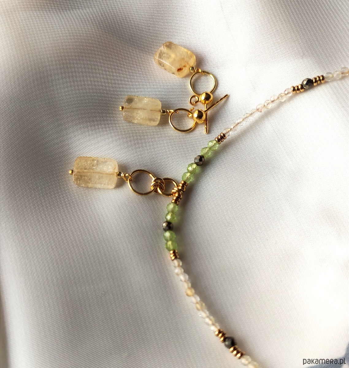 Delikatny, rozświetlający naszyjnik wykonany z kamieni cytrynu, oliwinu i pirytu. Z zawieszką z cytrynu zawieszonego na dwóch kółeczkach. Wykorzystane kamienie cytrynu i oliwinu połączeniu z pirytem stanowią trio pomyślności - symbolizują bogactwo i dobrobyt.