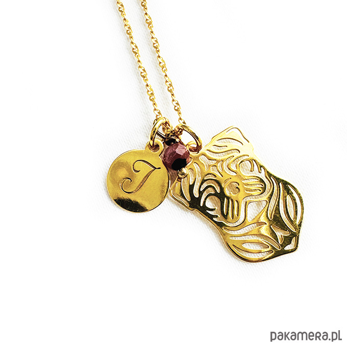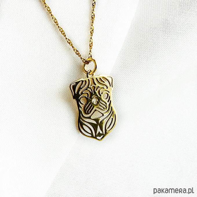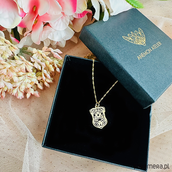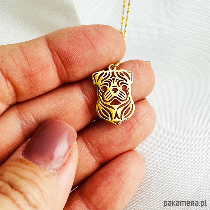 Efektowny wyjątkowy naszyjnik z zawieszką z głową pieska rasy mops. Naszyjnik jest delikatny, ale przykuwający uwagę. Wykonany ze srebra próby 925 złocony 24 k złotem .