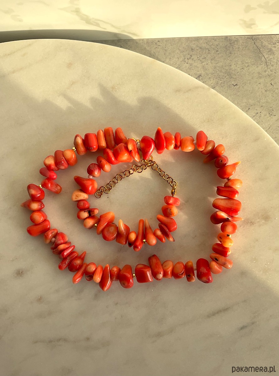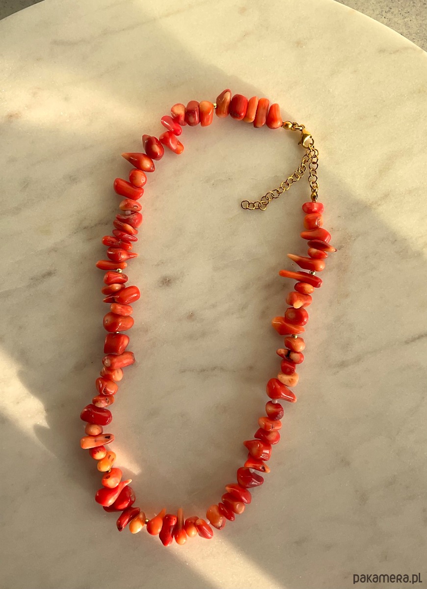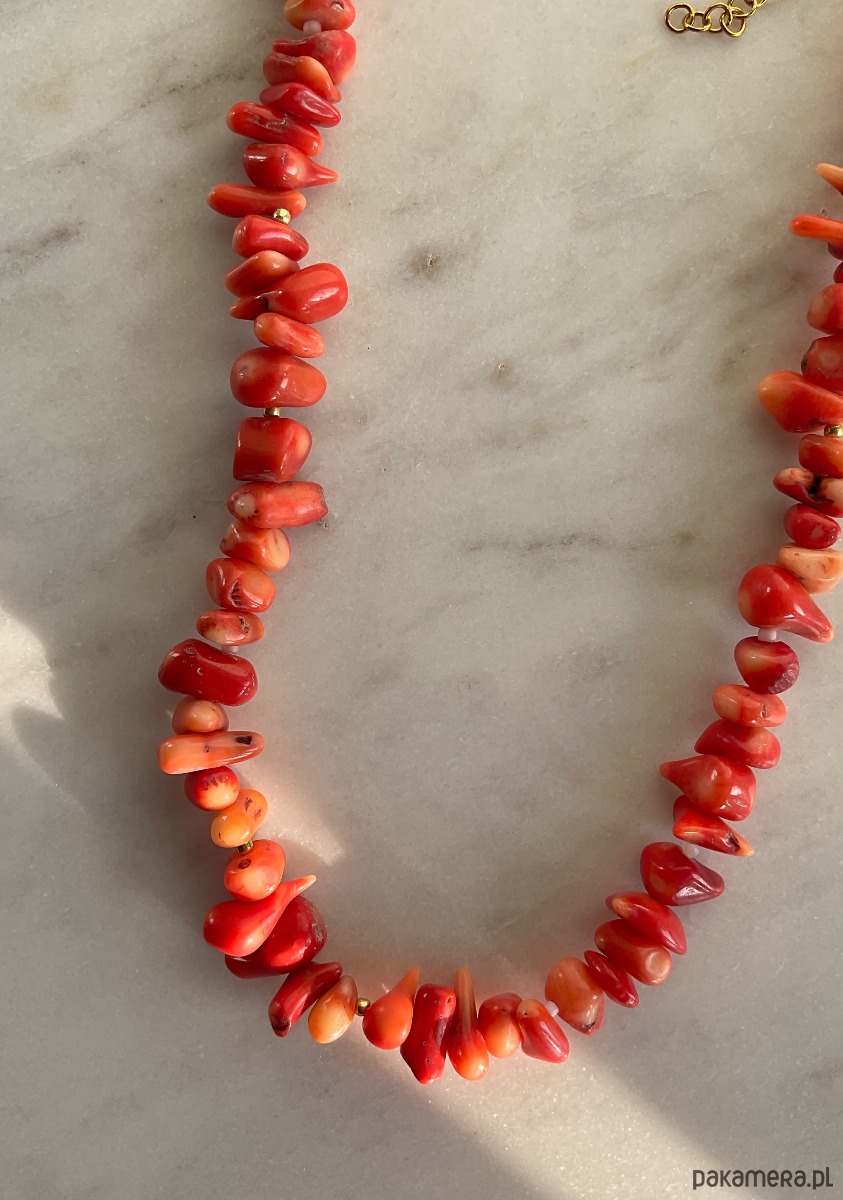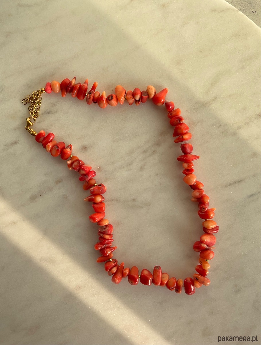 Naszyjnik z pomarańczowego koralu naturalnego o nieregularnym kształcie, przeplatany drobnymi koralikami najwyższej jakości.