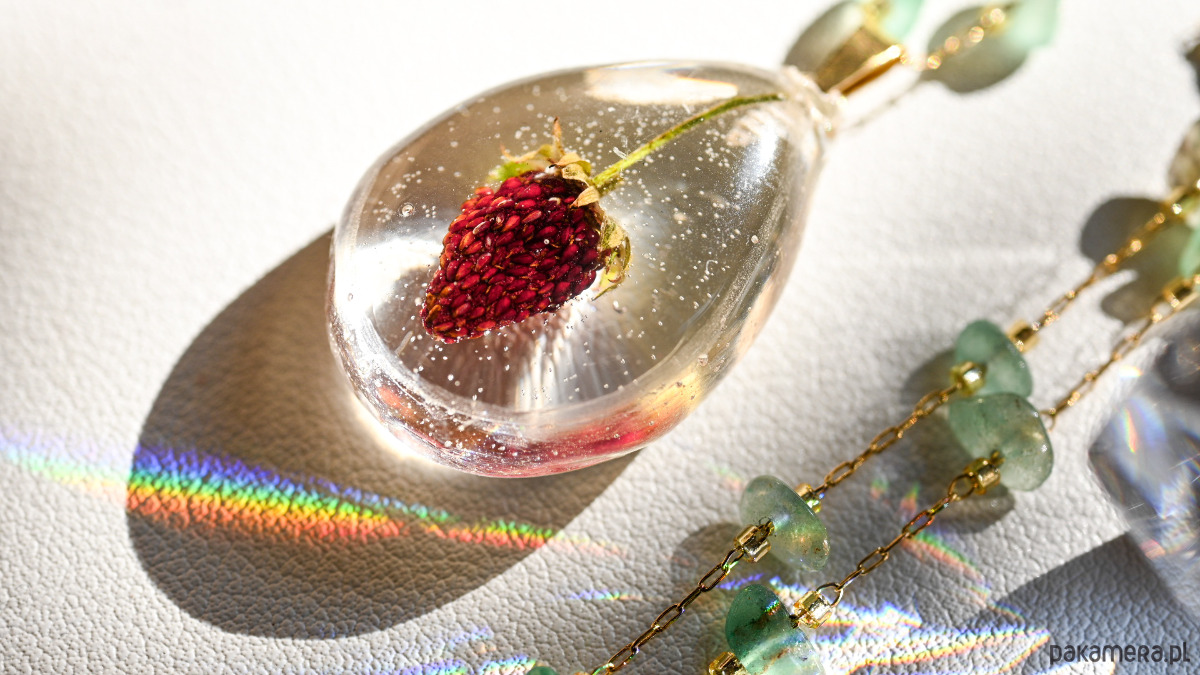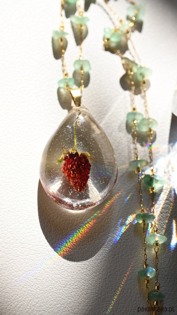 Unikatowy naszyjnik z prawdziwą suszoną poziomką zatopioną w przezroczystej żywicy i zielonymi kamieniami awenturynu.