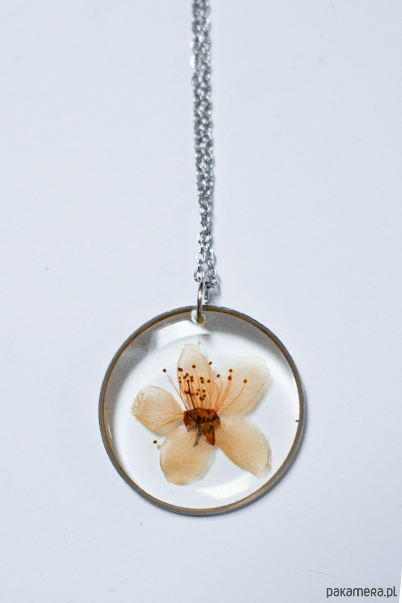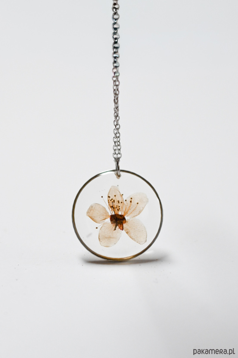 Subtelny, okrągły naszyjnik z prawdziwym kwiatem wiśni utrwalonym w krystalicznej żywicy. Minimalistyczny design, który celebruje piękno natury.