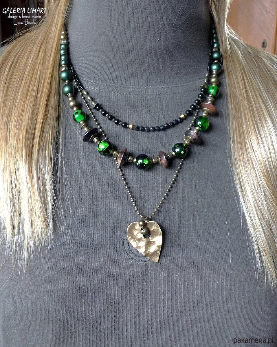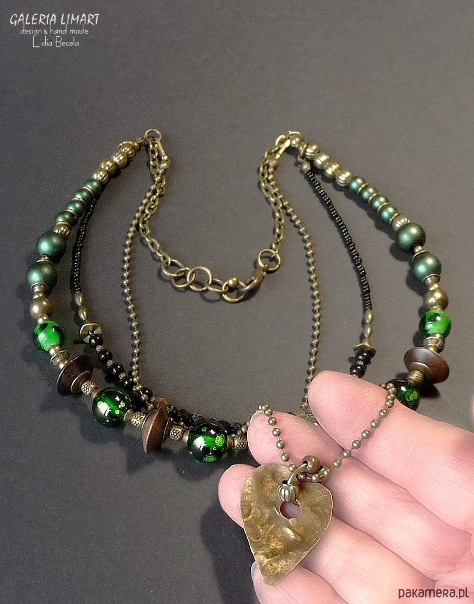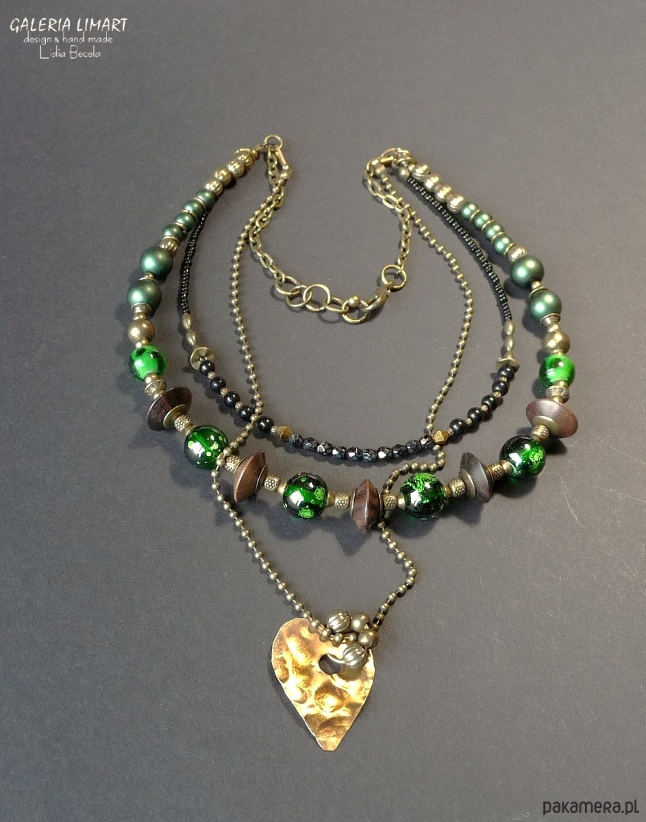 Moja nieco zwariowana kompozycja naszyjnika w duchu bardzo modnej biżuterii Boho (bohemy, cyganerii artystycznej, new hippie style) z szalonego mixu szkła weneckiego w obłędnej zieleni, szklanych perełek i hebanowego drewna, ozdób mosiężnych i miedzianych typu bali, drobnych koralików i paciorków. Dodatkowo zdobiony ręcznie wyciętym i repusowanym (kutym) sercem z miedzi, zawieszonym na kulkowym łańcuszku, który dzięki karabińczykom łatwo odpiąć i nosić oddzielnie jako inny naszyjnik. Jednym słowem 3w1. Kupujesz jeden naszyjnik - masz 3 :).