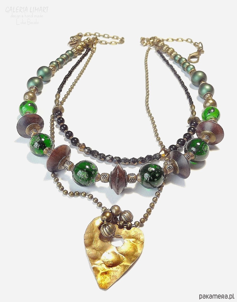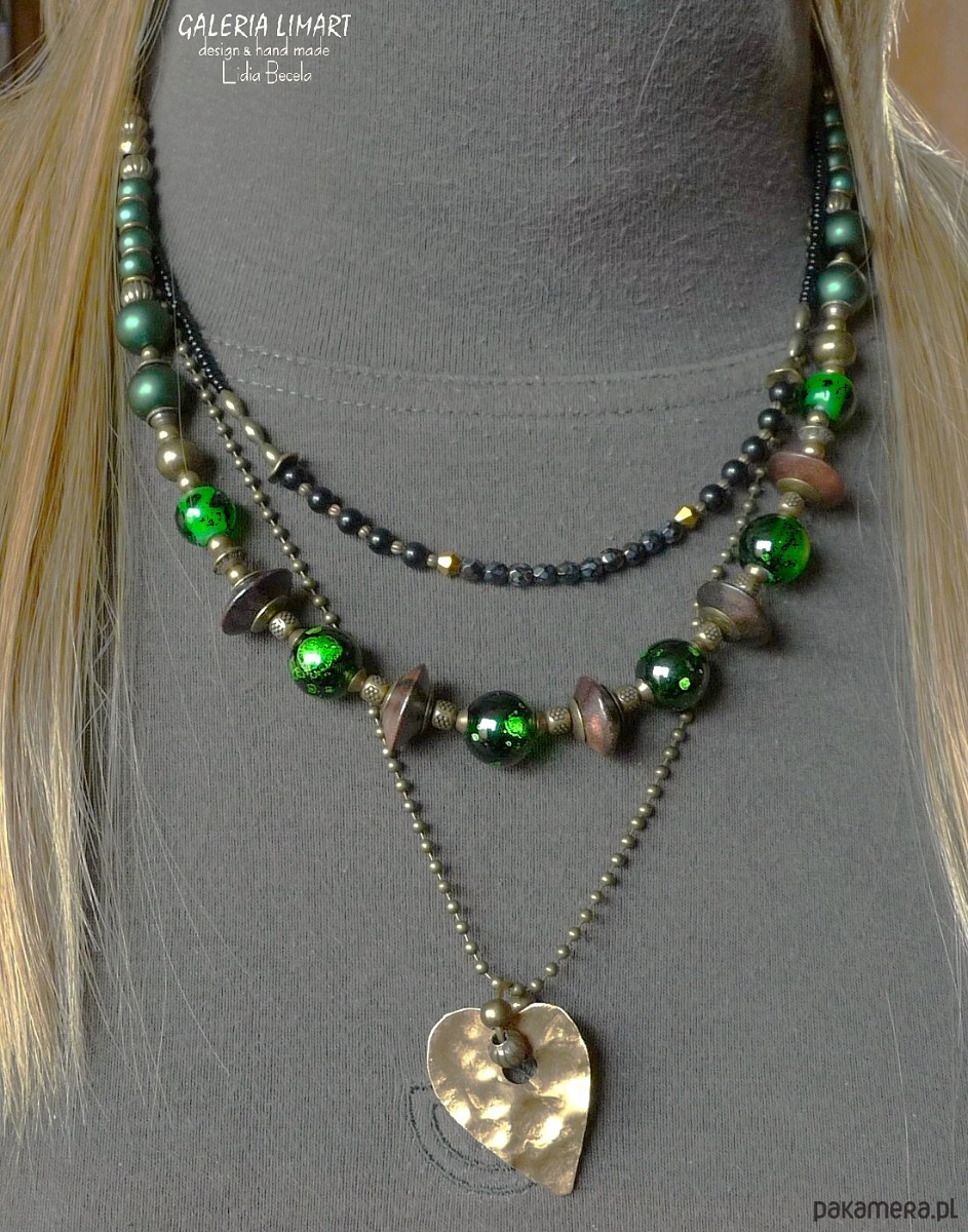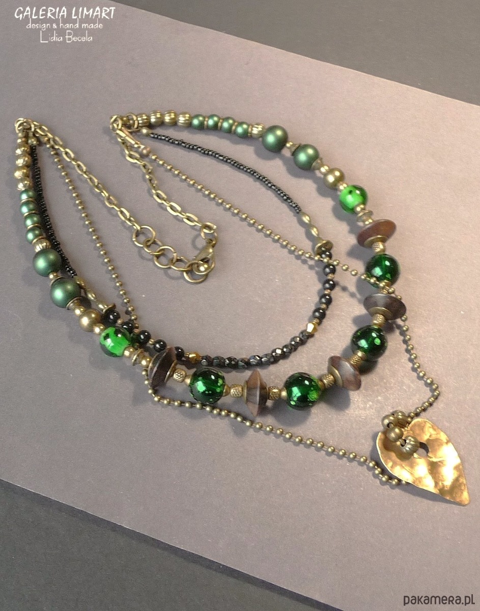 Moja nieco zwariowana kompozycja naszyjnika w duchu bardzo modnej biżuterii Boho (bohemy, cyganerii artystycznej, new hippie style) z szalonego mixu szkła weneckiego w obłędnej zieleni, szklanych perełek i hebanowego drewna, ozdób mosiężnych i miedzianych typu bali, drobnych koralików i paciorków. Dodatkowo zdobiony ręcznie wyciętym i repusowanym (kutym) sercem z miedzi, zawieszonym na kulkowym łańcuszku, który dzięki karabińczykom łatwo odpiąć i nosić oddzielnie jako inny naszyjnik. Jednym słowem 3w1. Kupujesz jeden naszyjnik - masz 3 :).
