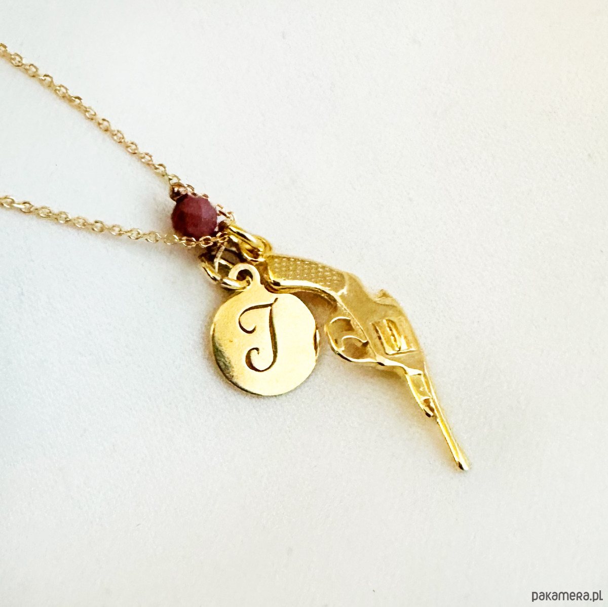 Delikatny naszyjnik z zawieszką w kształcie rewolweru. Może być personalizowany literką i kamieniem.