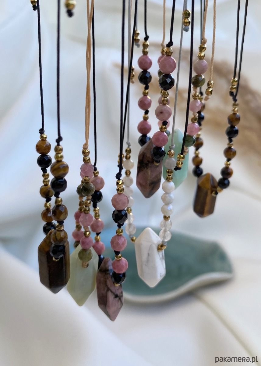 ▪️Długość naszyjnika wynosi około 65cm. Zapięcie to wiązanie makramowe, którym reguluje się obwód poprzez przesunięcie, dlatego też można nosić go na różnych wysokościach.