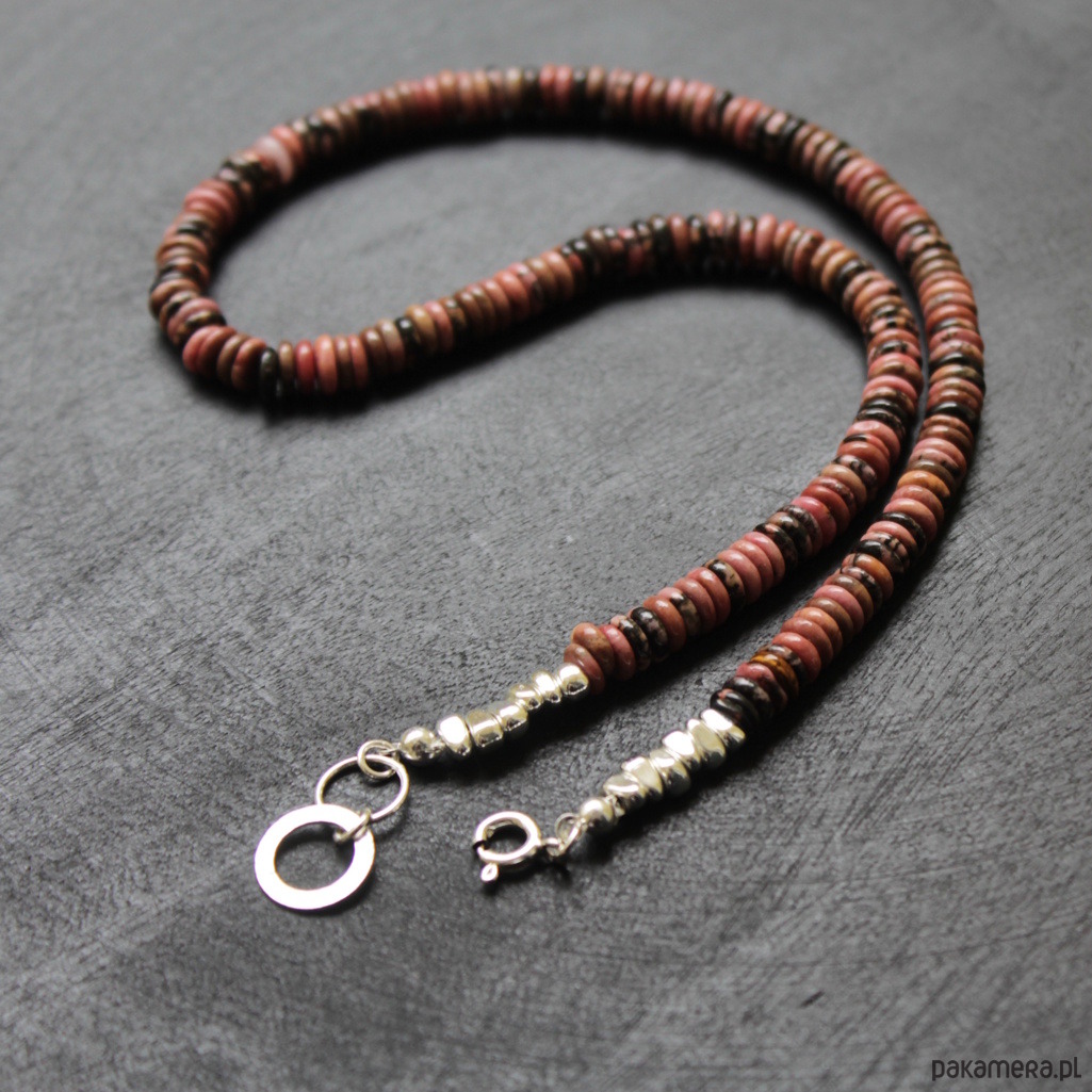 Naszyjnik wykonany został ze srebra próby 925 oraz oponek różowo czarnych rodonitów oraz srebrnego hematytu.