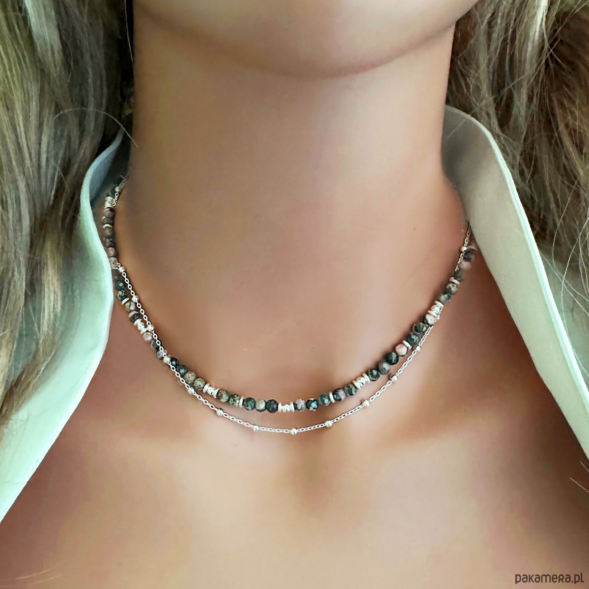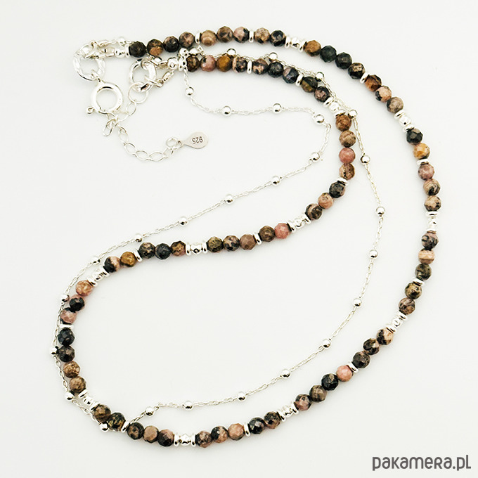 Efektowny, elegancki naszyjnik, stworzony z jednego sznura kamieni naturalnych rodonitów w odcieniach , szarości i delikatnego różu i srebrnego łańcuszka kulkowego.