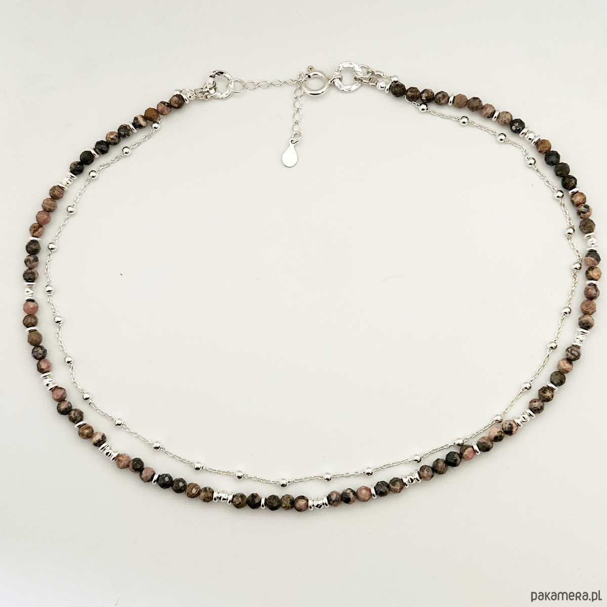 Efektowny, elegancki naszyjnik, stworzony z jednego sznura kamieni naturalnych rodonitów w odcieniach , szarości i delikatnego różu i srebrnego łańcuszka kulkowego.