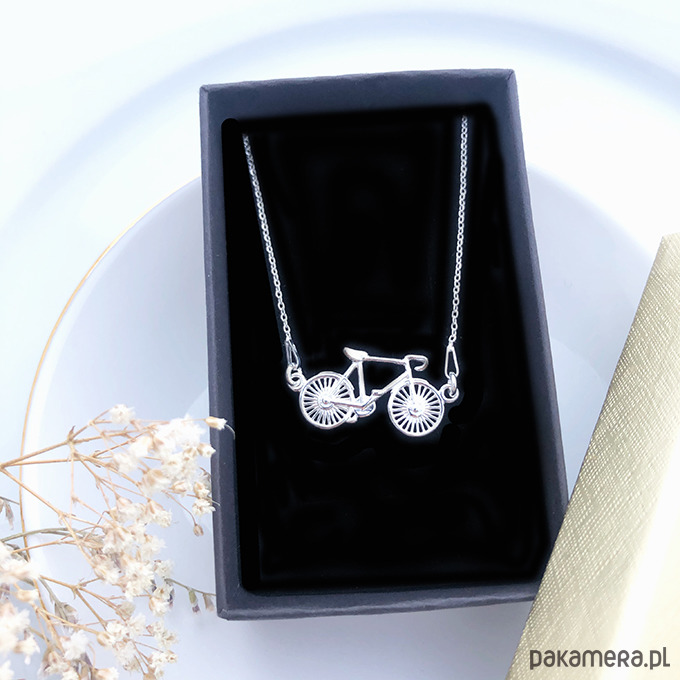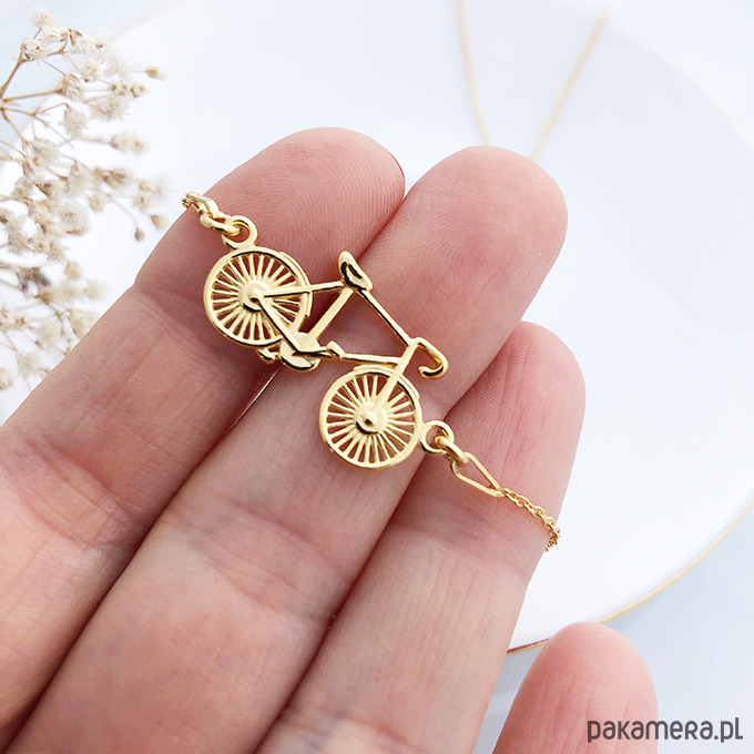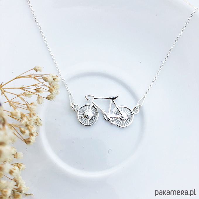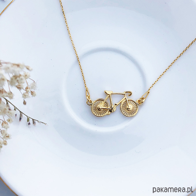 Naszyjnik z zawieszką w kształcie roweru. Z obu stron zawieszka jest taka sama, Wykonany ze srebra próby 925 i złocony 24 k złotem.