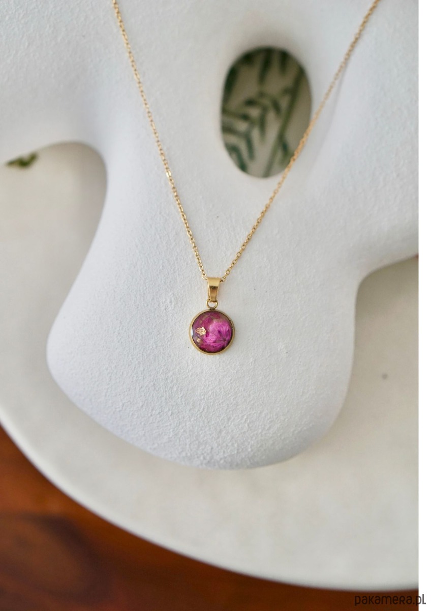 Naszyjnik wykonany ręcznie z suszonych kwiatów oraz żywicy epoksydowej. Wielkość zawieszki 10 mm. Długość łańcuszka 50 cm. Ramka oraz łańcuszek wykonane ze stali chirurgicznej w kolorze złotym. Naszyjnik pakowany jest w eleganckie pudełeczko prezentowe. Żywica epoksydowa nazywana „szkłem jubilerskim” jest coraz częściej stosowanym materiałem w tworzeniu biżuterii. Po zastygnięciu cechuje się wysokim połyskiem oraz przepięknie wydobywa kształt wraz z kolorem zatopionych elementów.