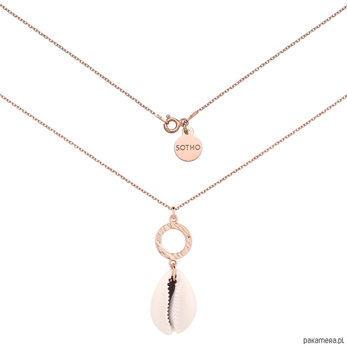 Złoty naszyjnik łańcuszkowy zdobiony chropowatym kółeczkiem i muszelką oraz zawieszką z logo marki. Całość wykonana ze srebra 925 powlekanego 18 karatowym różowym złotem.