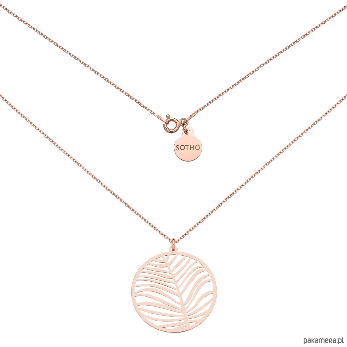 Złoty naszyjnik łańcuszkowy zdobiony dużą rozetą i zawieszką z logo marki. Całość wykonana ze srebra 925 powlekanego 18 karatowym różowym złotem.