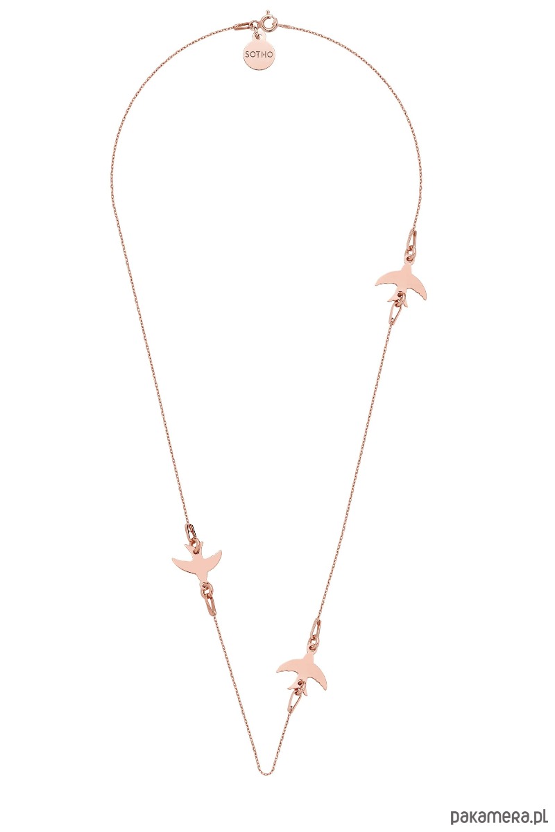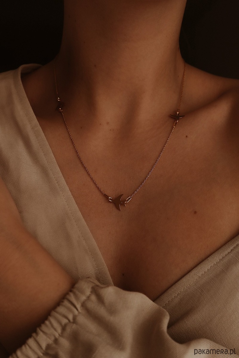Złoty naszyjnik łańcuszkowy z jaskółkami i zawieszką z logo marki. Całość wykonana ze srebra 925 powlekanego 18 karatowym różowym złotem.