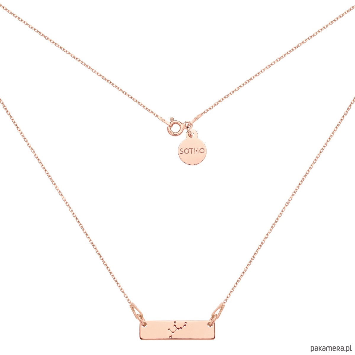 Złoty naszyjnik łańcuszkowy zdobiony konstelacją zodiakalną Panny i zawieszką z logo marki. Całość wykonana ze srebra 925 powlekanego 18 karatowym różowym złotem.