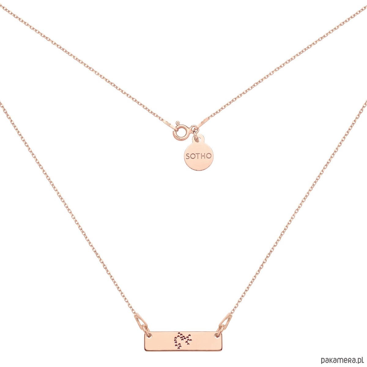 Złoty naszyjnik łańcuszkowy zdobiony konstelacją zodiakalną Strzelca i zawieszką z logo marki. Całość wykonana ze srebra 925 powlekanego 18 karatowym różowym złotem.