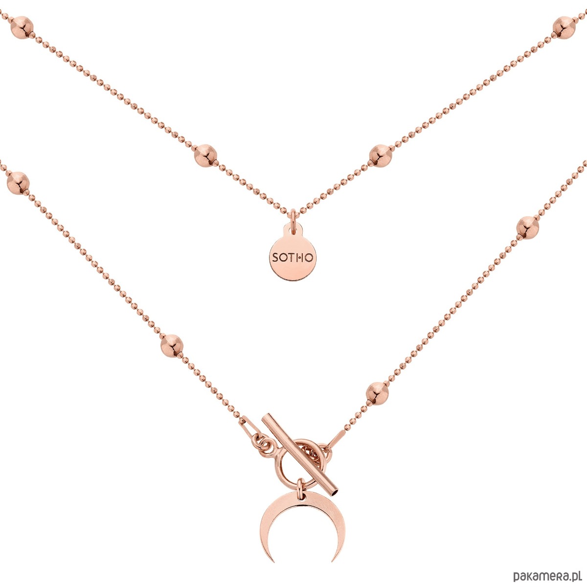 Złoty naszyjnik z ozdobnym zapięciem, księżycem i zawieszką z logo marki. Całość wykonana ze srebra 925 powlekanego 18 karatowym różowym złotem.