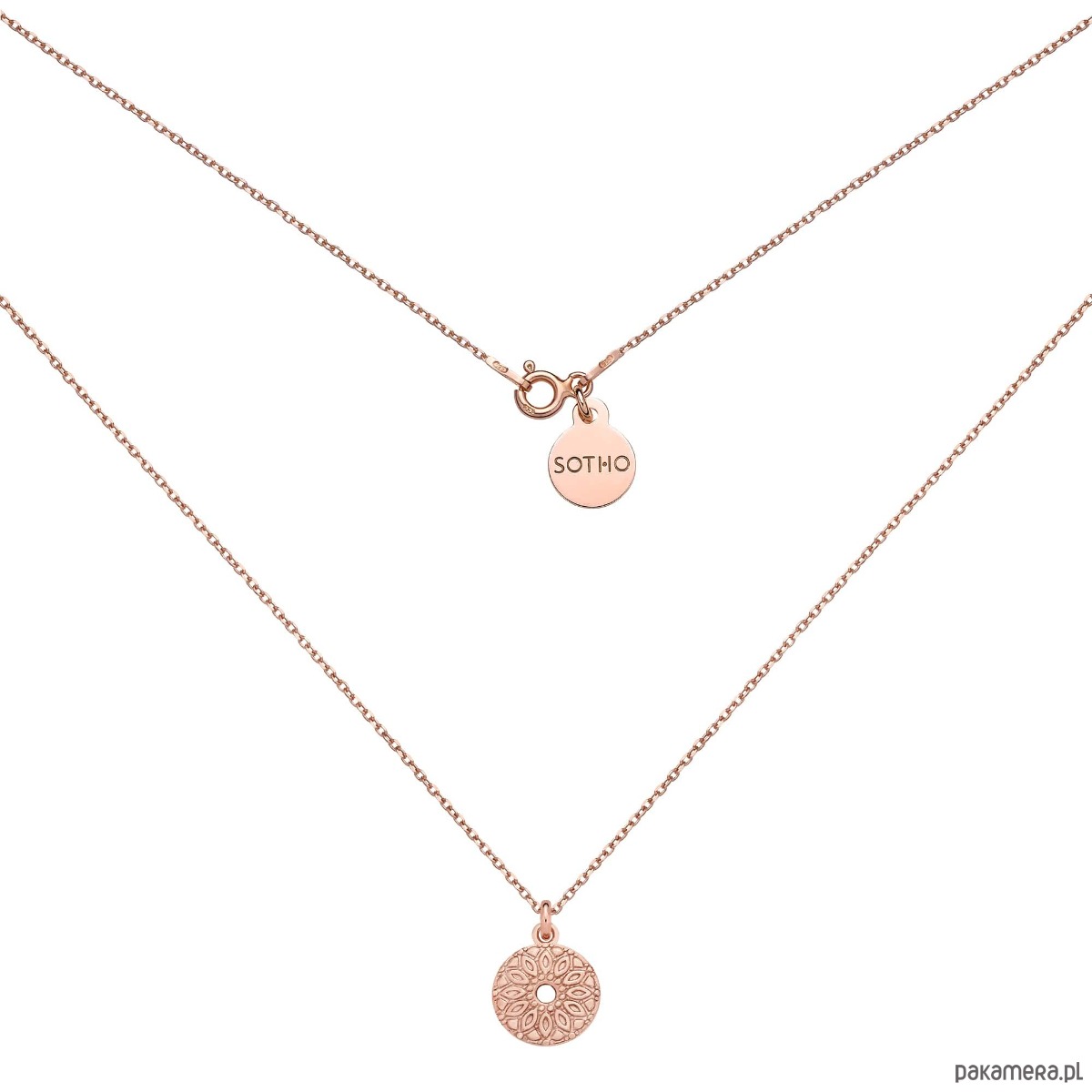 Złoty naszyjnik łańcuszkowy z medalionem i zawieszką z logo marki. Całość wykonana ze srebra 925 powlekanego 18 karatowym różowym złotem.