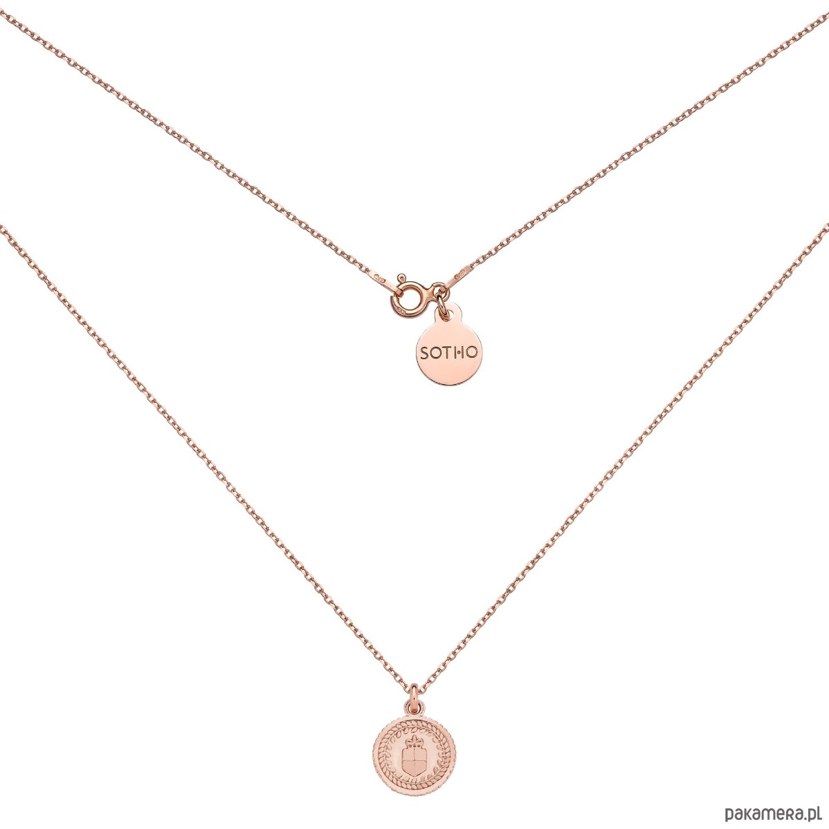 Złoty naszyjnik łańcuszkowy z medalionem i zawieszką z logo marki. Całość wykonana ze srebra 925 powlekanego 18 karatowym różowym złotem.