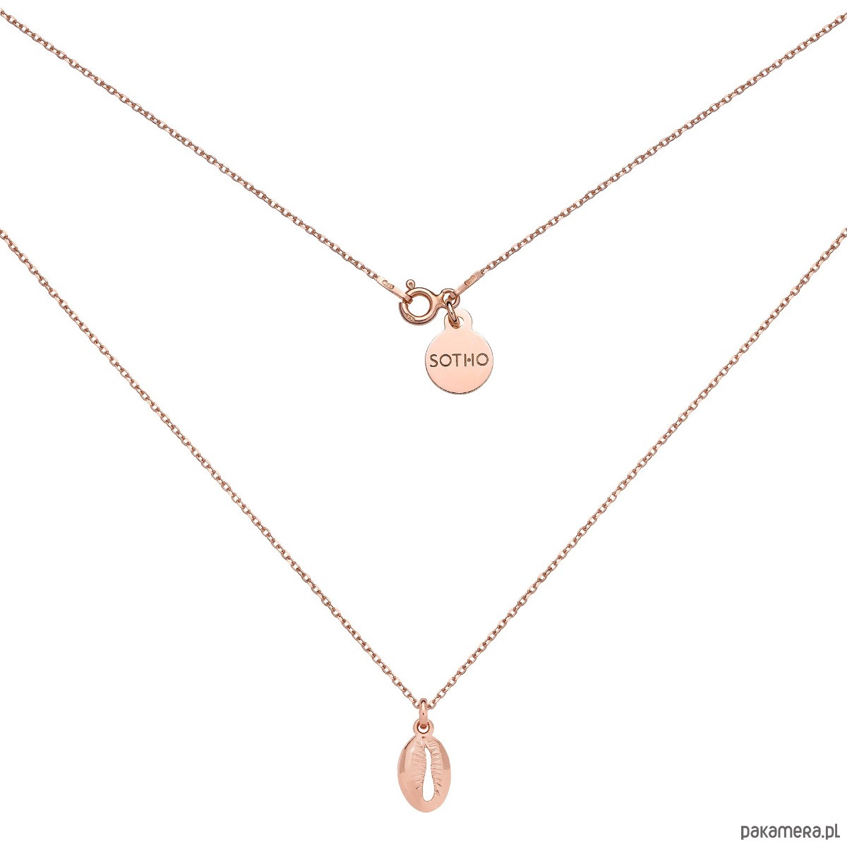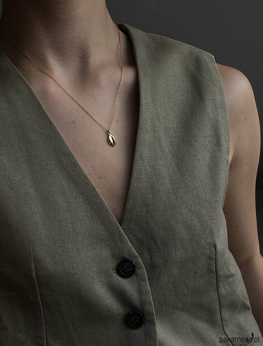 Złoty naszyjnik łańcuszkowy z muszelką oraz zawieszką z logo marki. Całość wykonana ze srebra 925 powlekanego 24 karatowym różowym złotem.