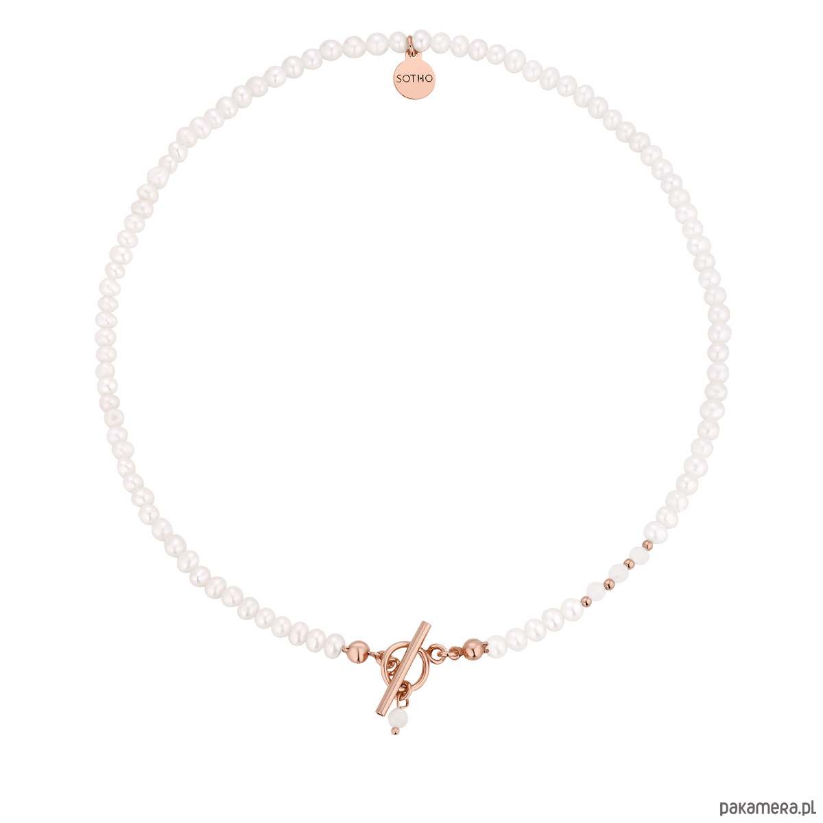 Złoty naszyjnik wykonany z naturalnych pereł słodkowodnych, fasetowanego kamienia księżycowego, złotych kuleczek i zawieszką z logo marki. Wszystkie elementy wykonane ze srebra 925 powlekanego 18 karatowym różowym złotem.