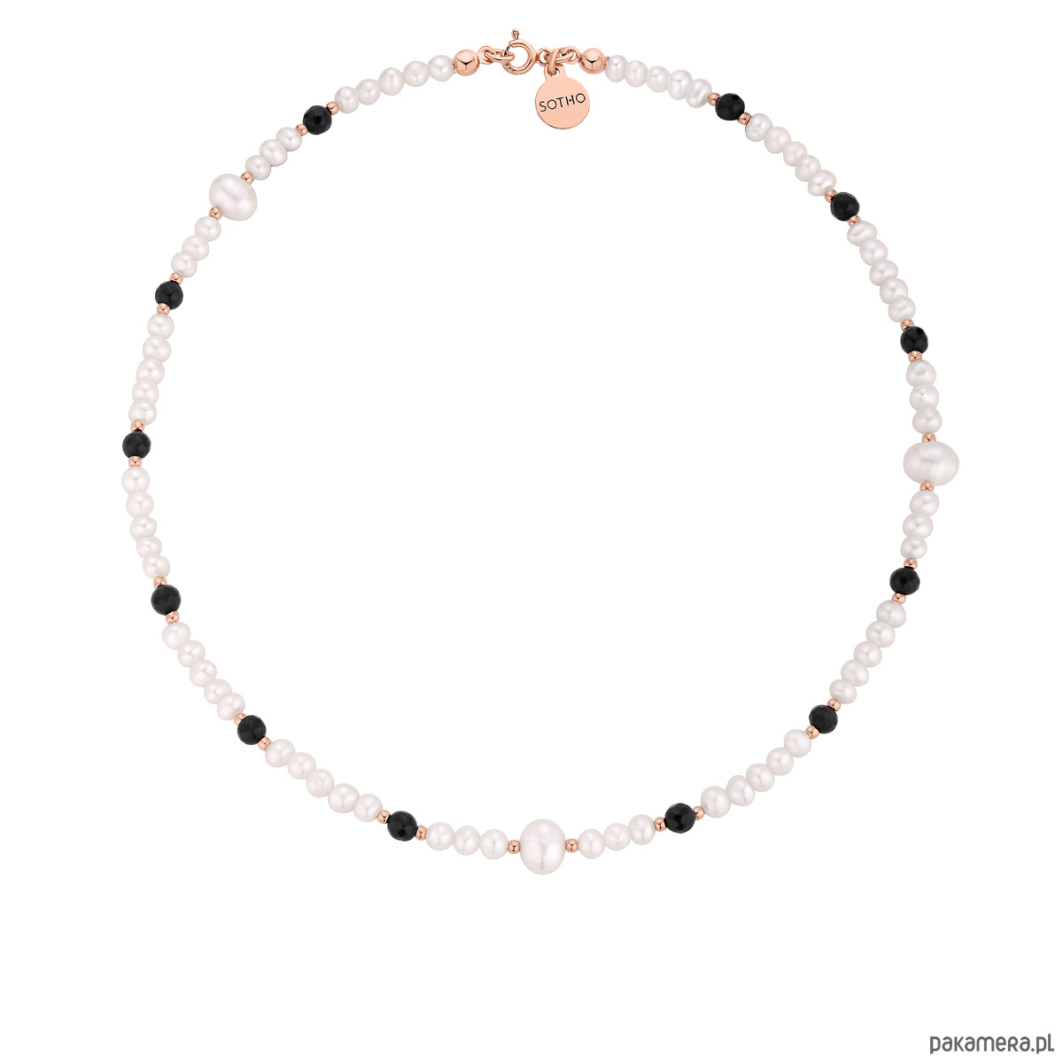 Złoty naszyjnik wykonany z naturalnych pereł słodkowodnych, onyksu, złotych kuleczek i zawieszki z logo marki. Wszystkie elementy wykonane ze srebra 925 powlekanego 18 karatowym różowym złotem.