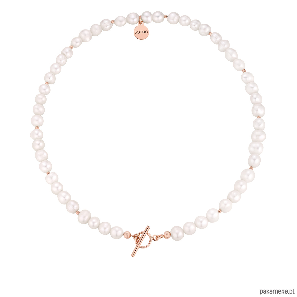 Złoty naszyjnik wykonany z naturalnych pereł słodkowodnych z ozdobnym zapięciem, złotymi kuleczkami i zawieszką z logo marki. Wszystkie elementy wykonane ze srebra 925 powlekanego 18 karatowym różowym złotem.