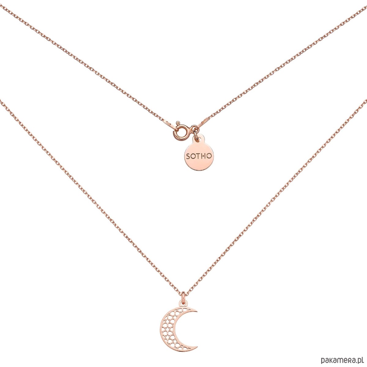 Złoty naszyjnik łańcuszkowy zdobiony ażurowym półksiężycem i zawieszką z logo marki. Całość wykonana ze srebra 925 powlekanego 18 karatowym różowym złotem.