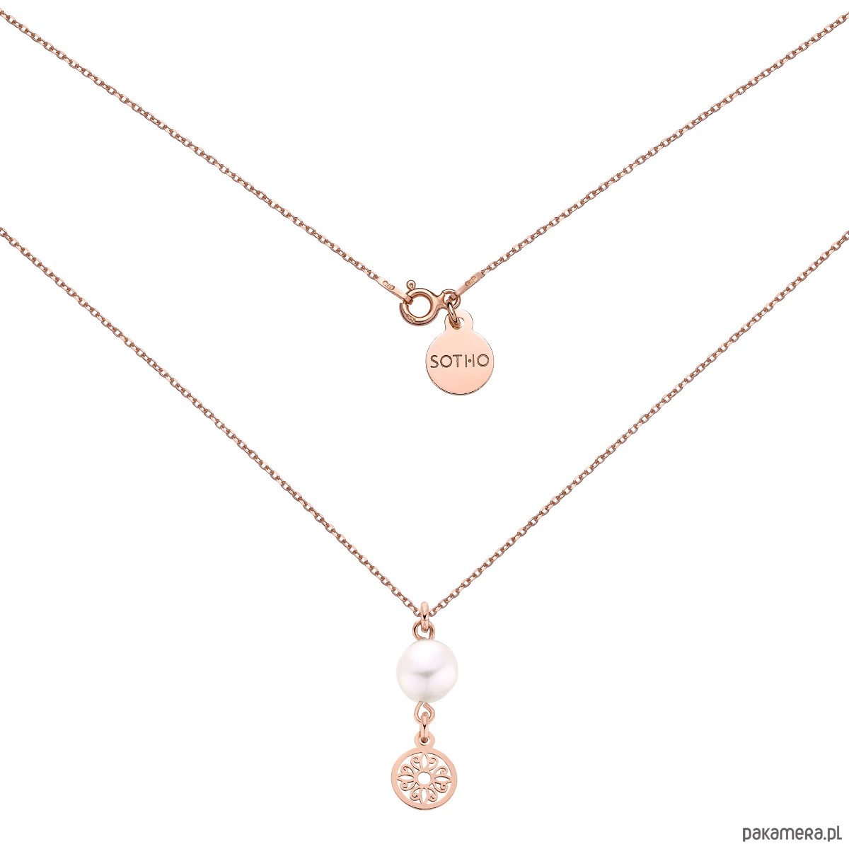 Złoty naszyjnik z rozetką i naturalną nieregularną perłą. Całość wykonana ze srebra 925 powlekanego 18 karatowym różowym złotem. Perła jest płaska, okrągła, nieregularna, unikatowa i może różnić się od tej na zdjęciu.