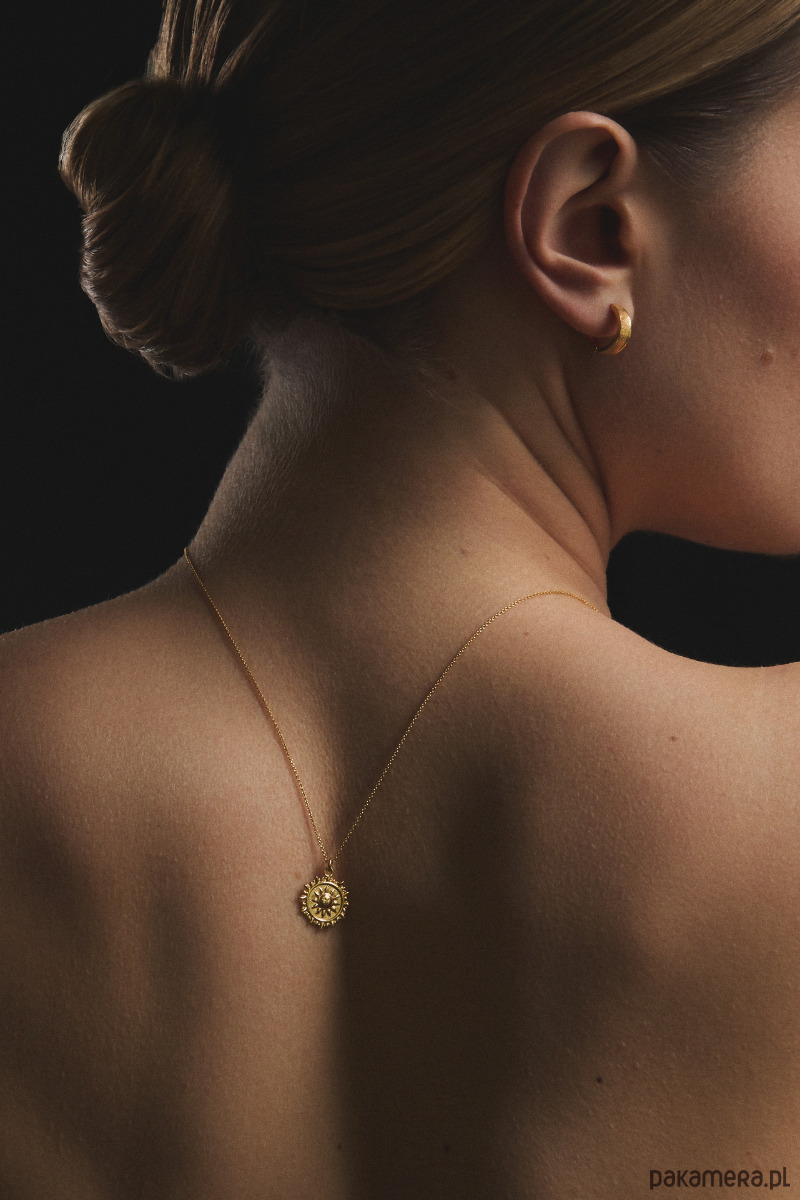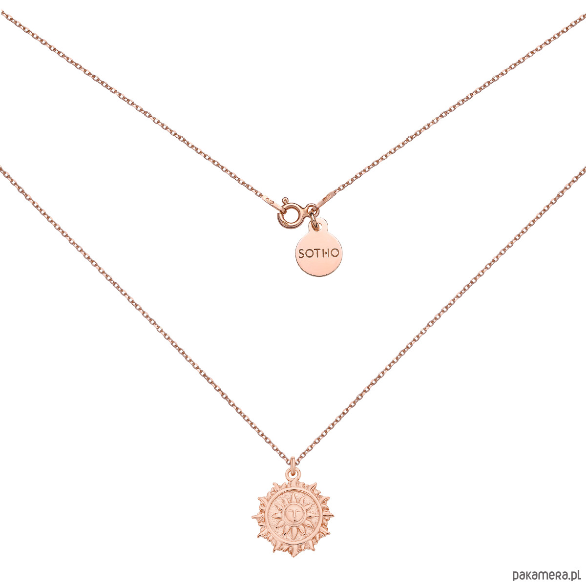 Złoty naszyjnik ze słońcem. Całość wykonana ze srebra 925 powlekanego 18 karatowym różowym złotem.