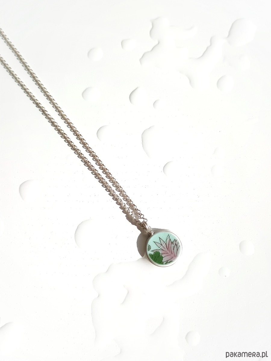 Oto naszyjnik, który wykonałam z fragmentu starej porcelany - stłuczonego talerza we wzory kwiatowe. Kawałek stłuczki oszlifowałam nadając okrągły ksztalt, oprawiłam w drucik i zamocowałam na srebrnym łańcuszku (srebro 925). Ceramikę zeszlifowałam również z grubości, dzięki czemu zawieszka nie jest masywna. Brzegi i tył pokryłam lakierem, co sprawia, że nie brudzą się i nie chłoną wilgoci. Średnica zawieszki ceramicznej: 14 mm. Długość łańcuszka w całości: 45 cm. Unikat - każdy z moich wyrobów występuje w jednym egzemplarzu. Upcykling - nie reprodukuję wykorzystywanych wzorów, niczego nie domalowuję - wykorzystuję wyłącznie oryginalne naczynia i motywy, które się na nich znajdują. Tym samym, stłuczce z odzysku nadaję nowe życie.