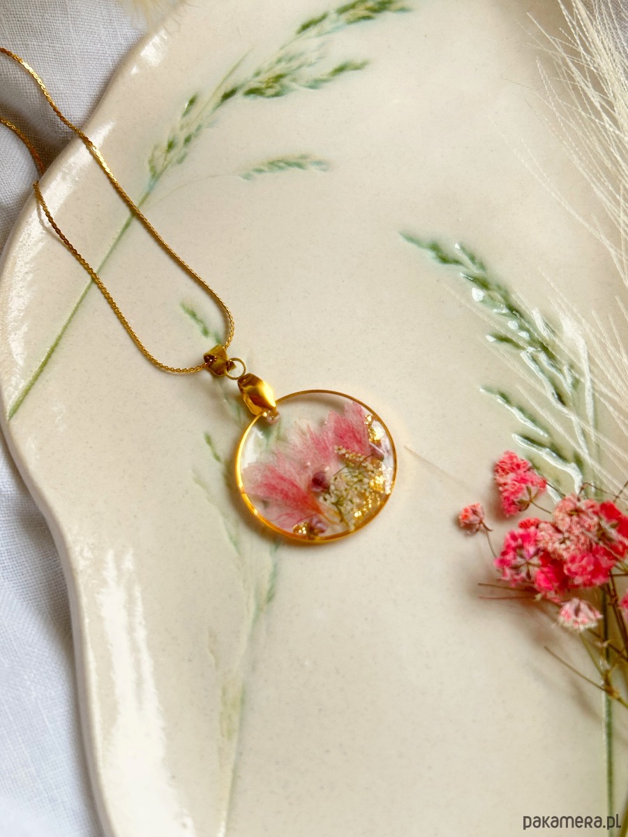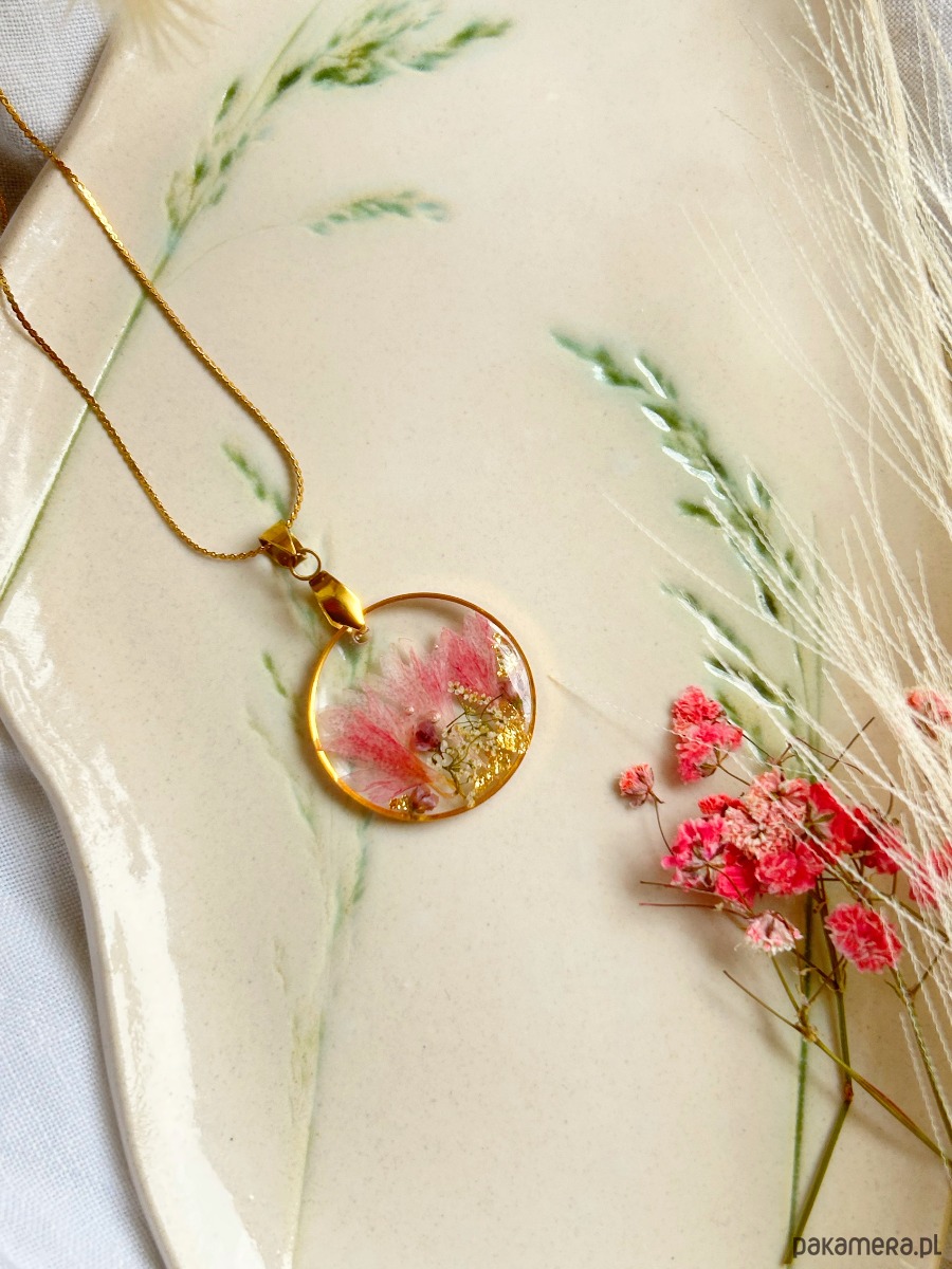 Ten delikatny naszyjnik z prawdziwymi, różowymi kwiatuszkami zatopionymi w krystalicznej żywicy to mała kapsuła piękna, którą możesz nosić zawsze przy sobie. Każdy detal – złote drobinki, pastelowe płatki, idealnie gładka tafla – tworzy biżuterię pełną romantycznego blasku i niezwykłej lekkości.