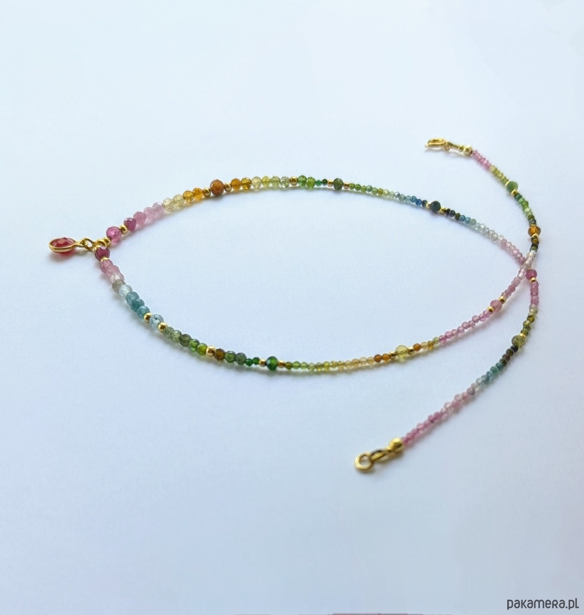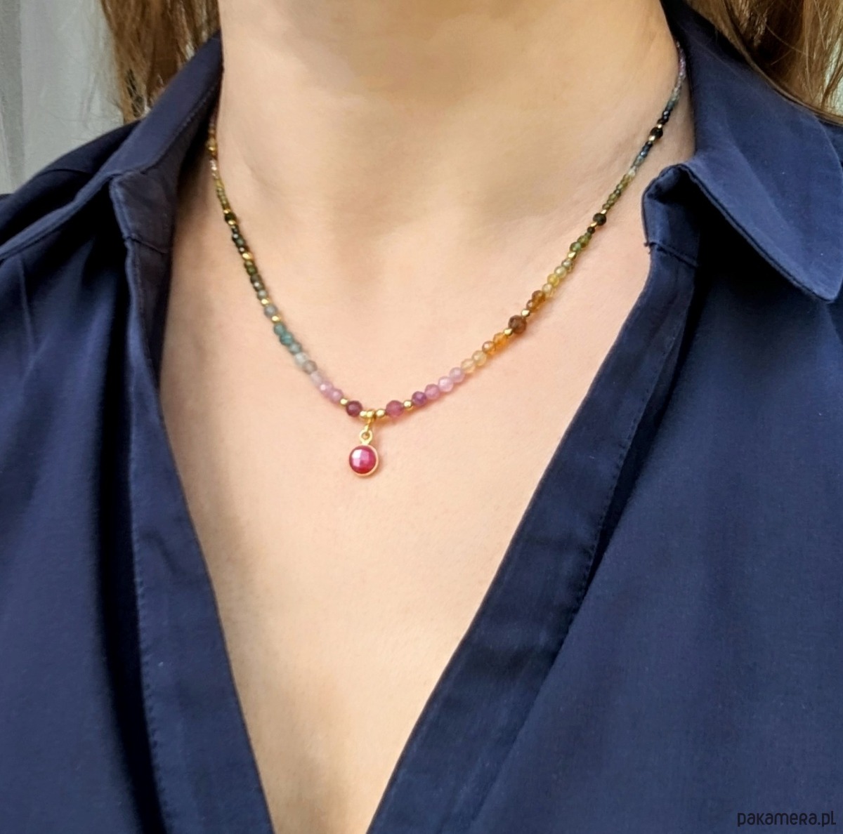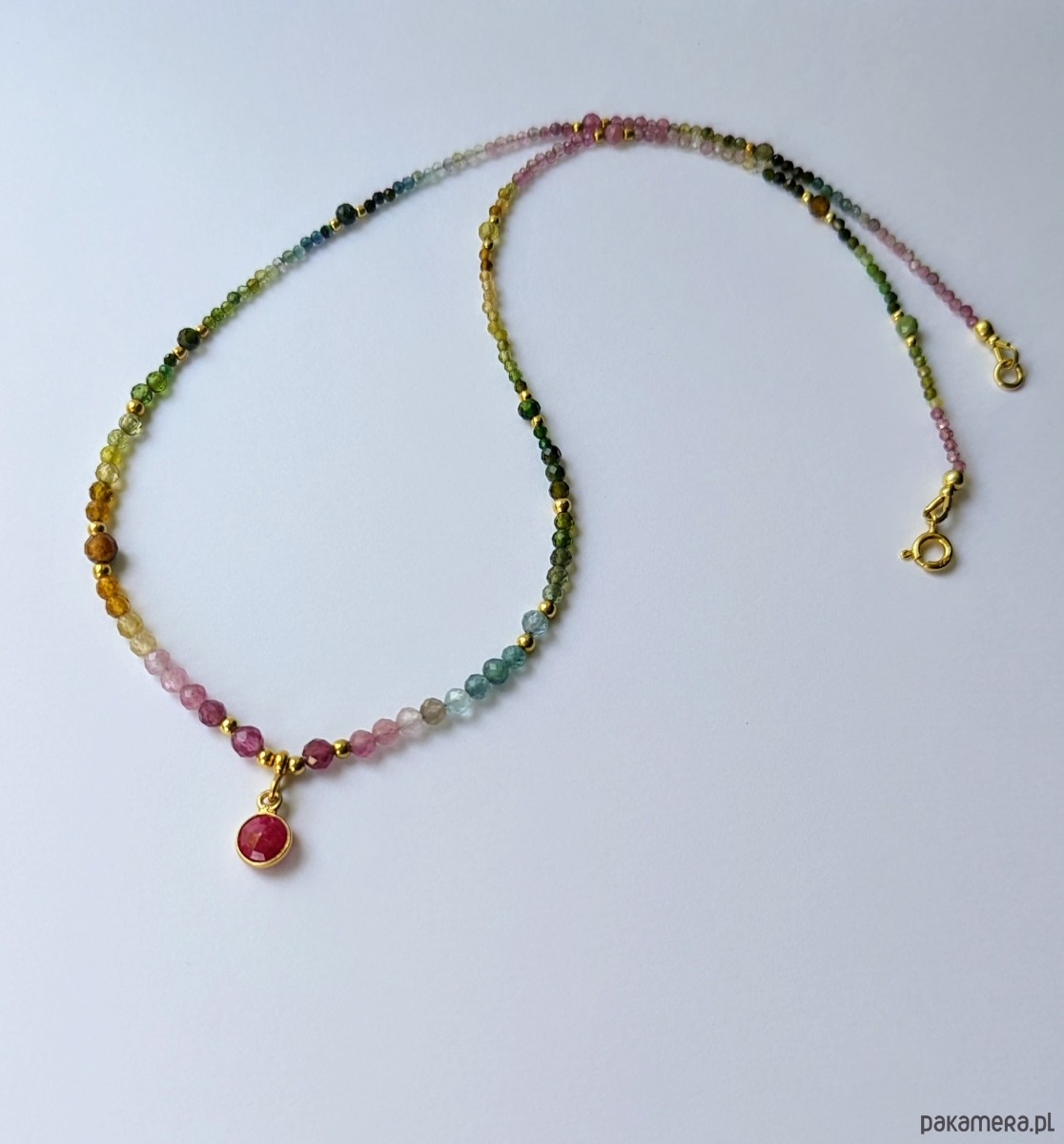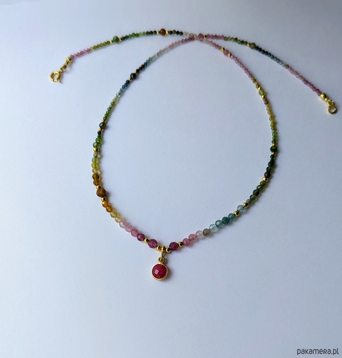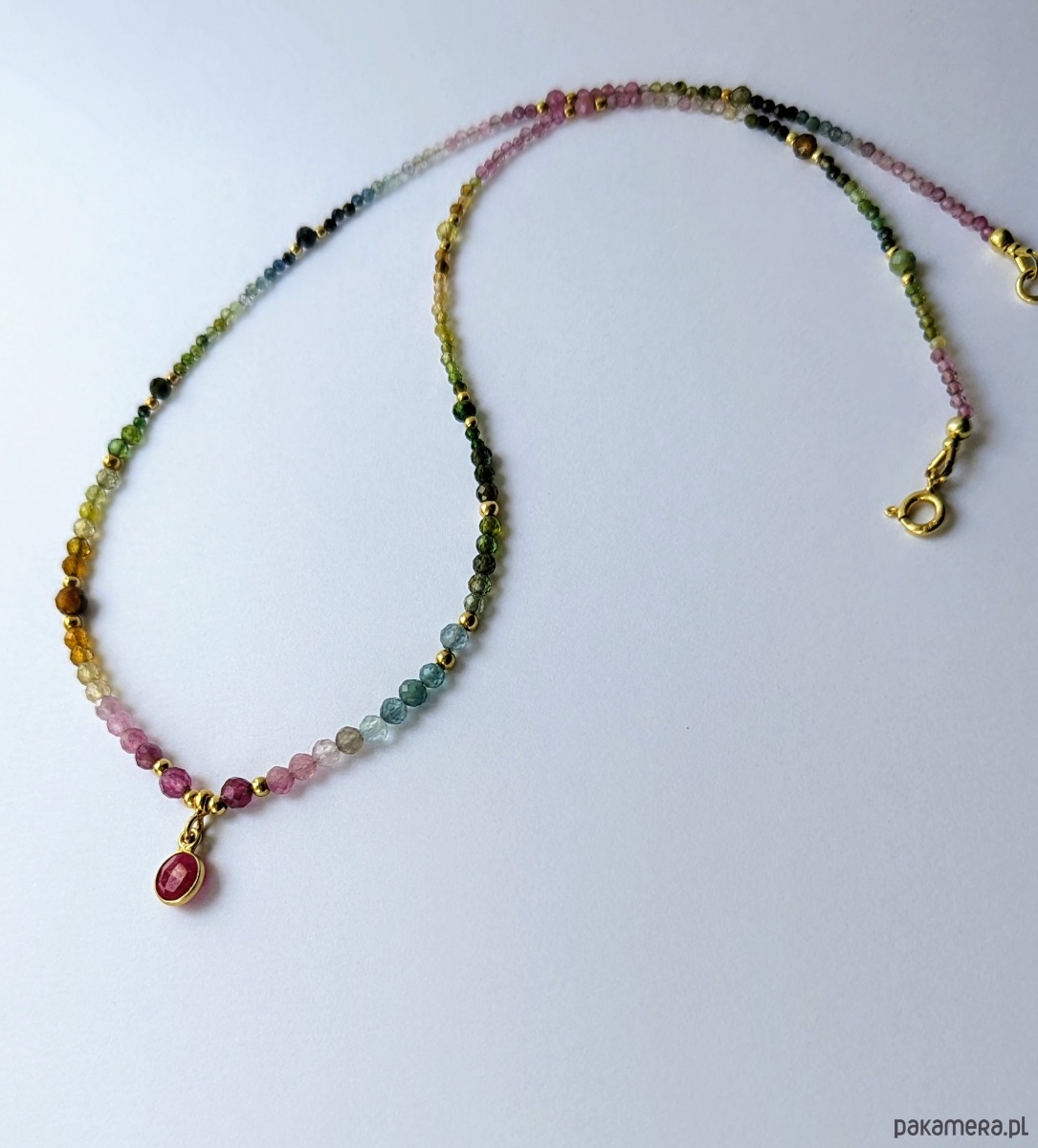Pełen pozytywnej energii naszyjnik z pięknych, klarownych turmalinów i z rubinową zawieszką. Barwny, asymetryczny, składa się z kolorowych sekwencji. Kamyki są drobne, fasetowane, przepuszczają światło. Chciałam uzyskać efekt tęczowej pryzmy światła na rosie. Dzięki wysokiej jakości kamieni naszyjnik - mimo swojej delikatności - przyciąga wzrok mocą bajecznych kolorów.
