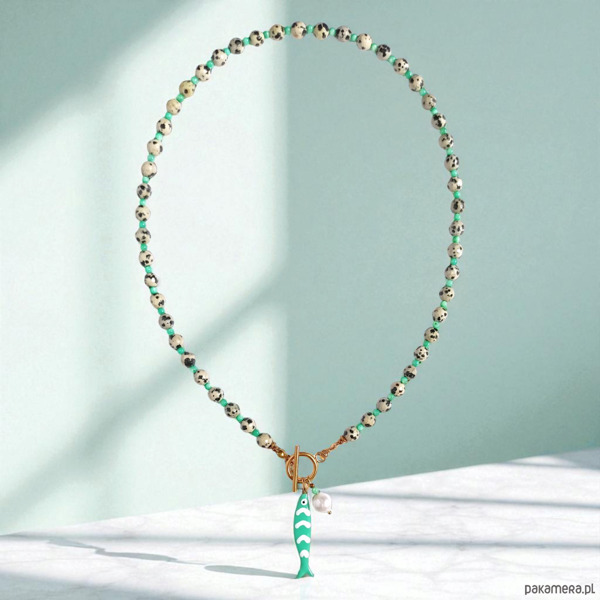 Naszyjnik z rybką : jaspis dalmatyński, masa perłowa, perła