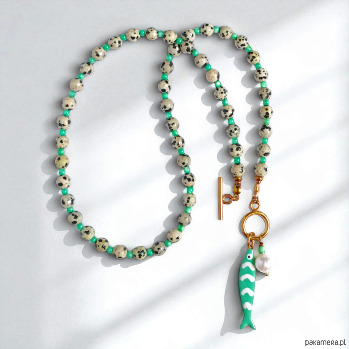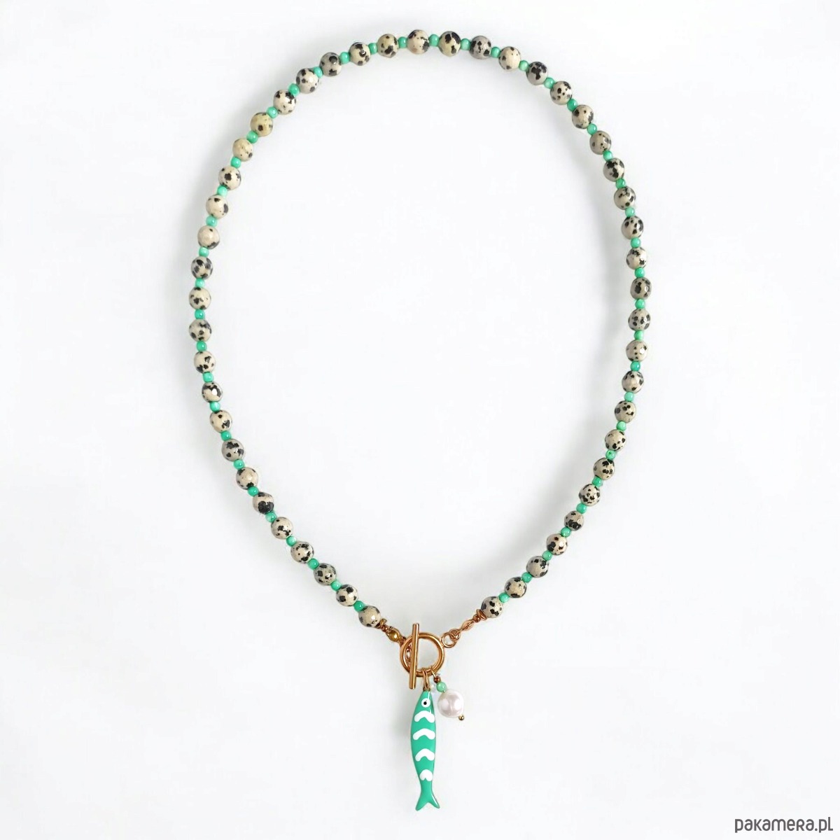 Naszyjnik z rybką : jaspis dalmatyński, masa perłowa, perła