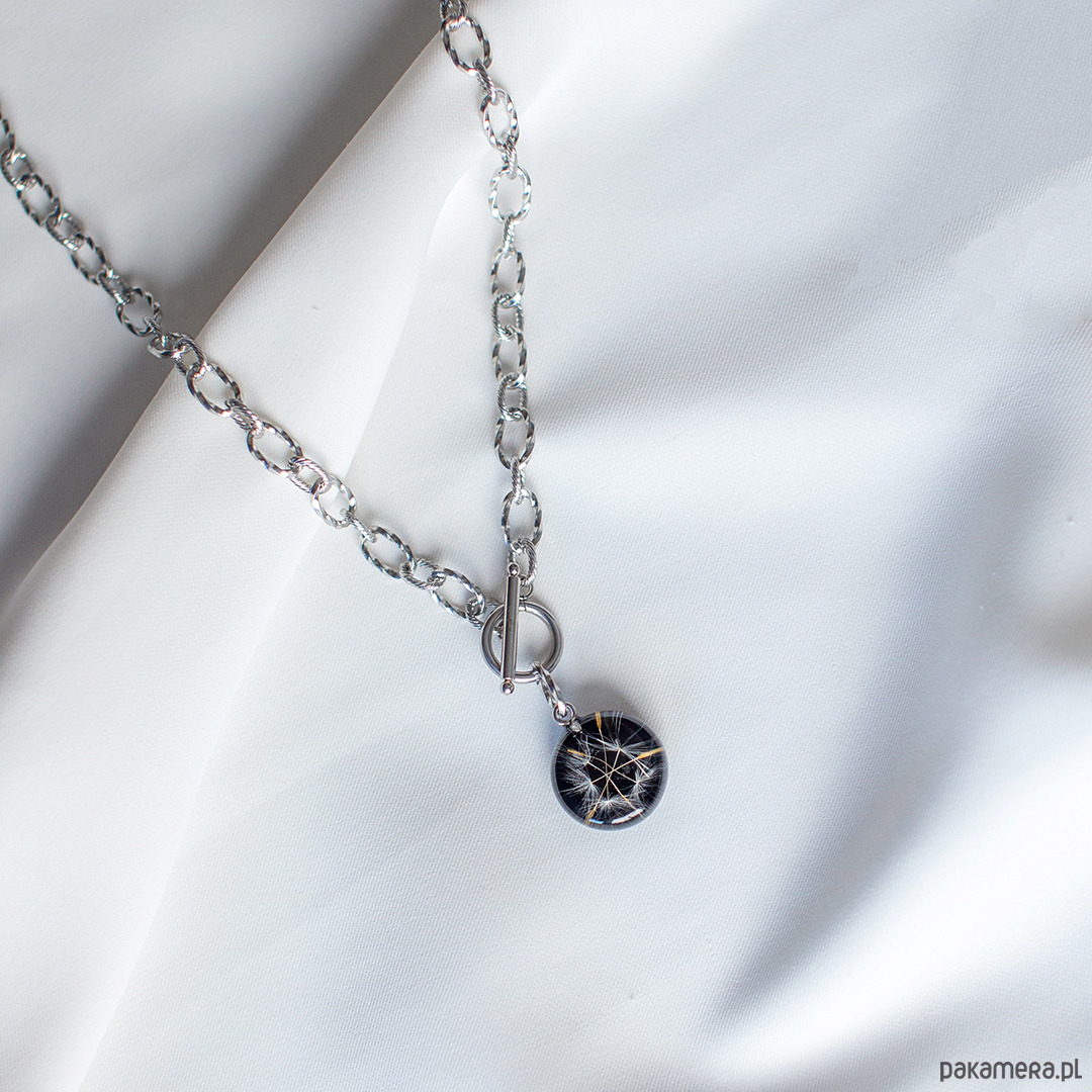 Naszyjnik wykonany jest z żywicy epoksydowej z wykorzystaniem suszonych kwiatów. Metalowe elementy to stal nierdzewna szlachetna chirurgiczna.
