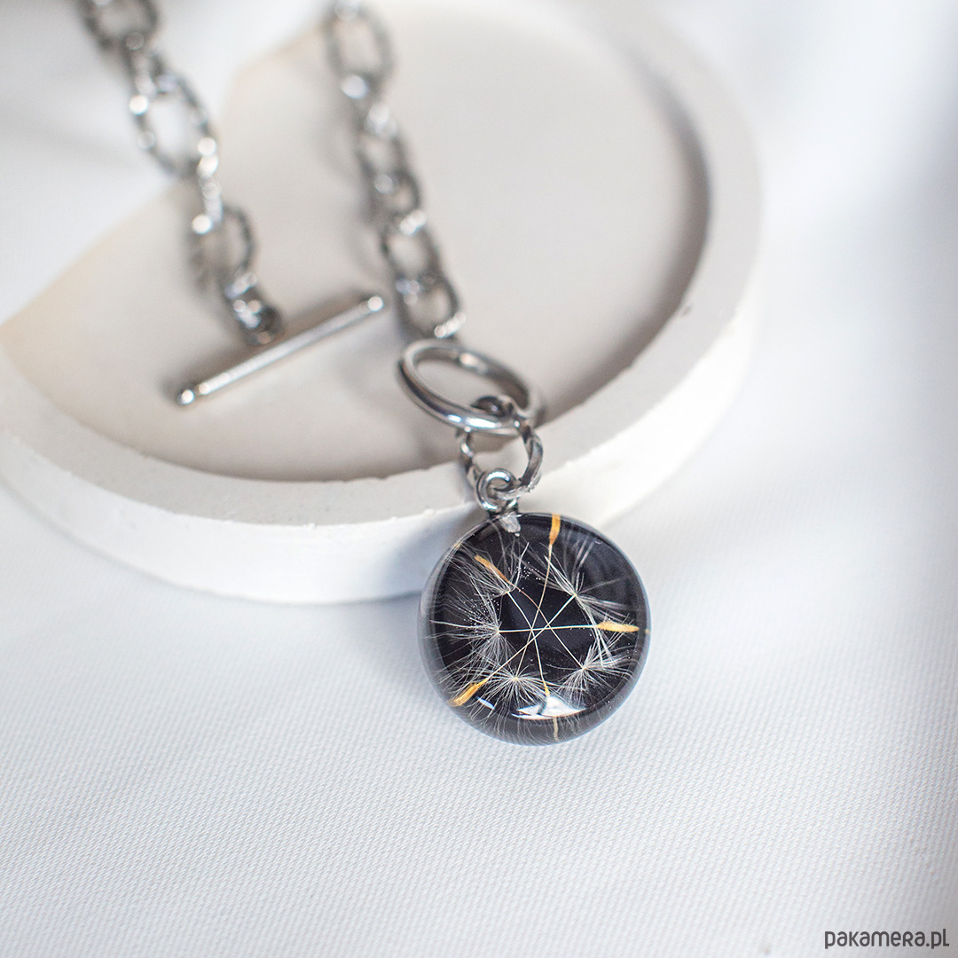 Naszyjnik wykonany jest z żywicy epoksydowej z wykorzystaniem suszonych kwiatów. Metalowe elementy to stal nierdzewna szlachetna chirurgiczna.