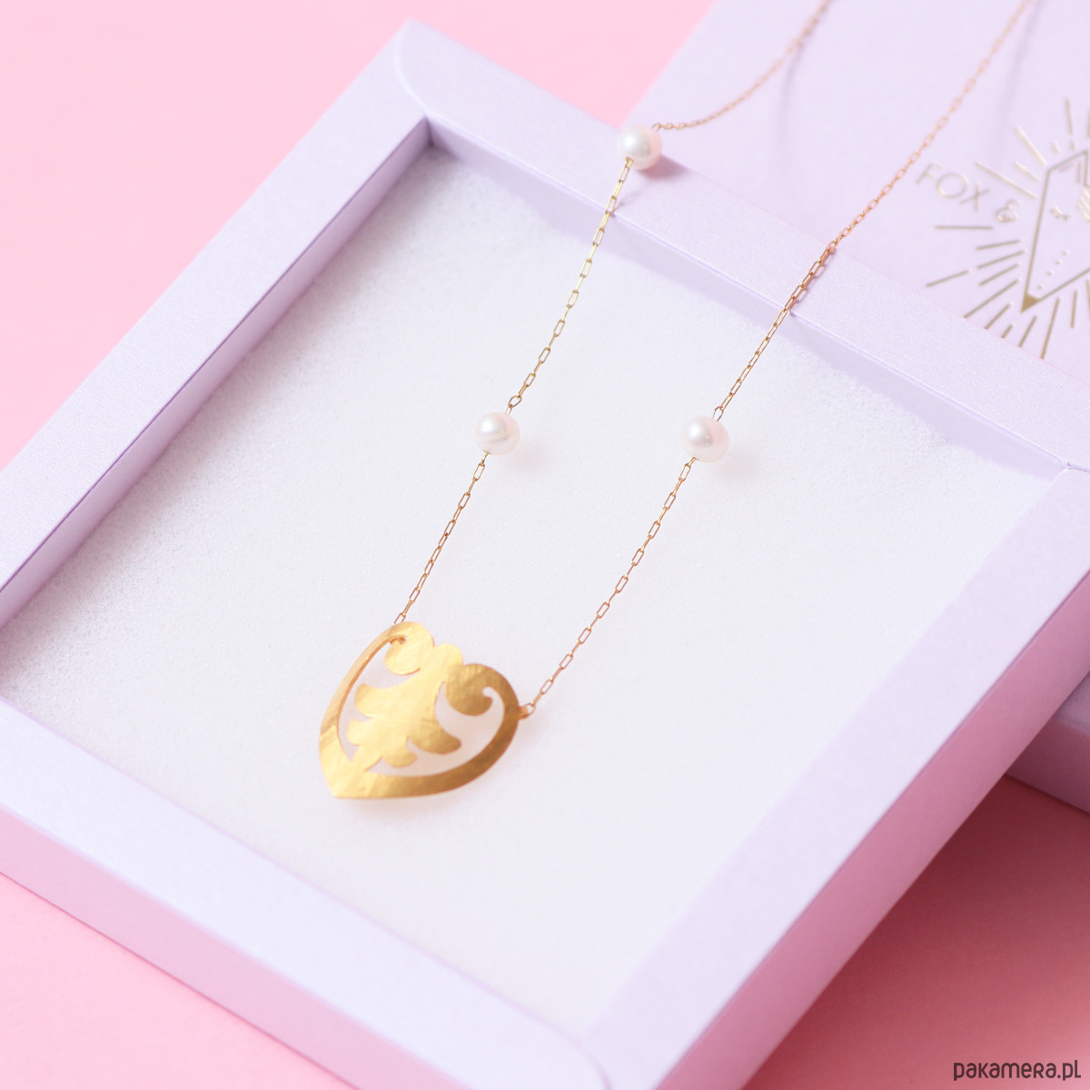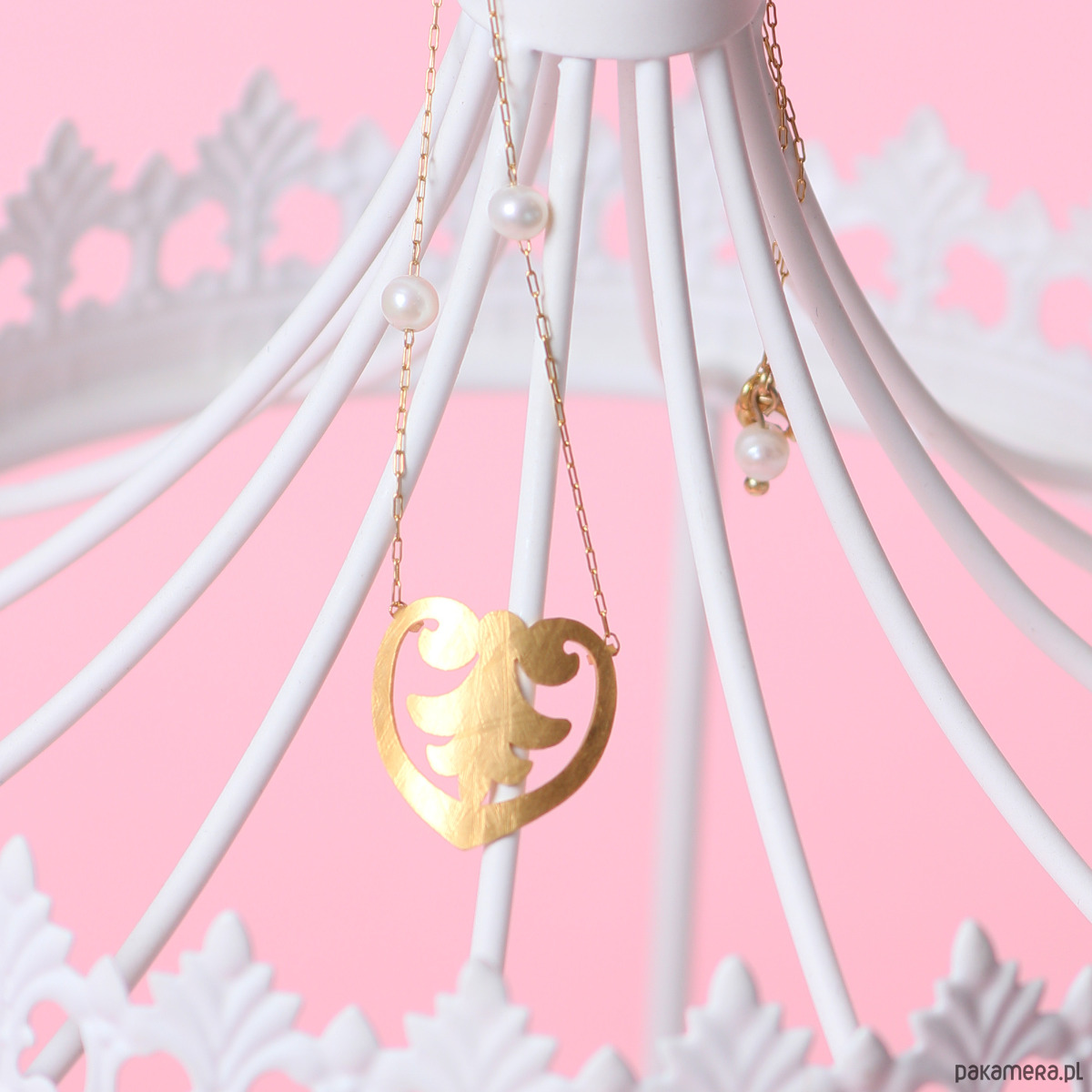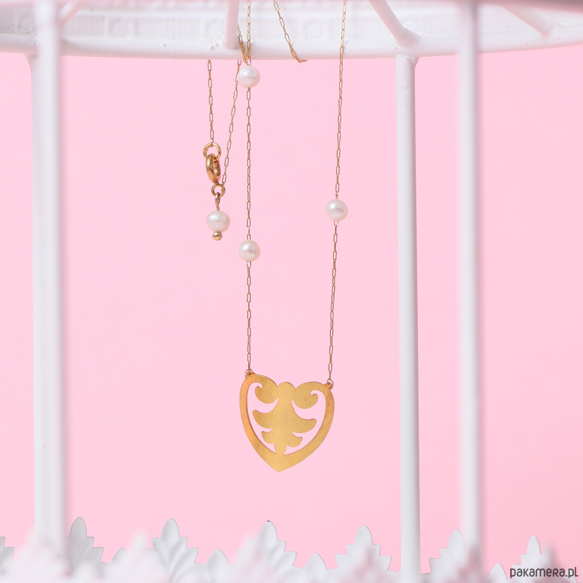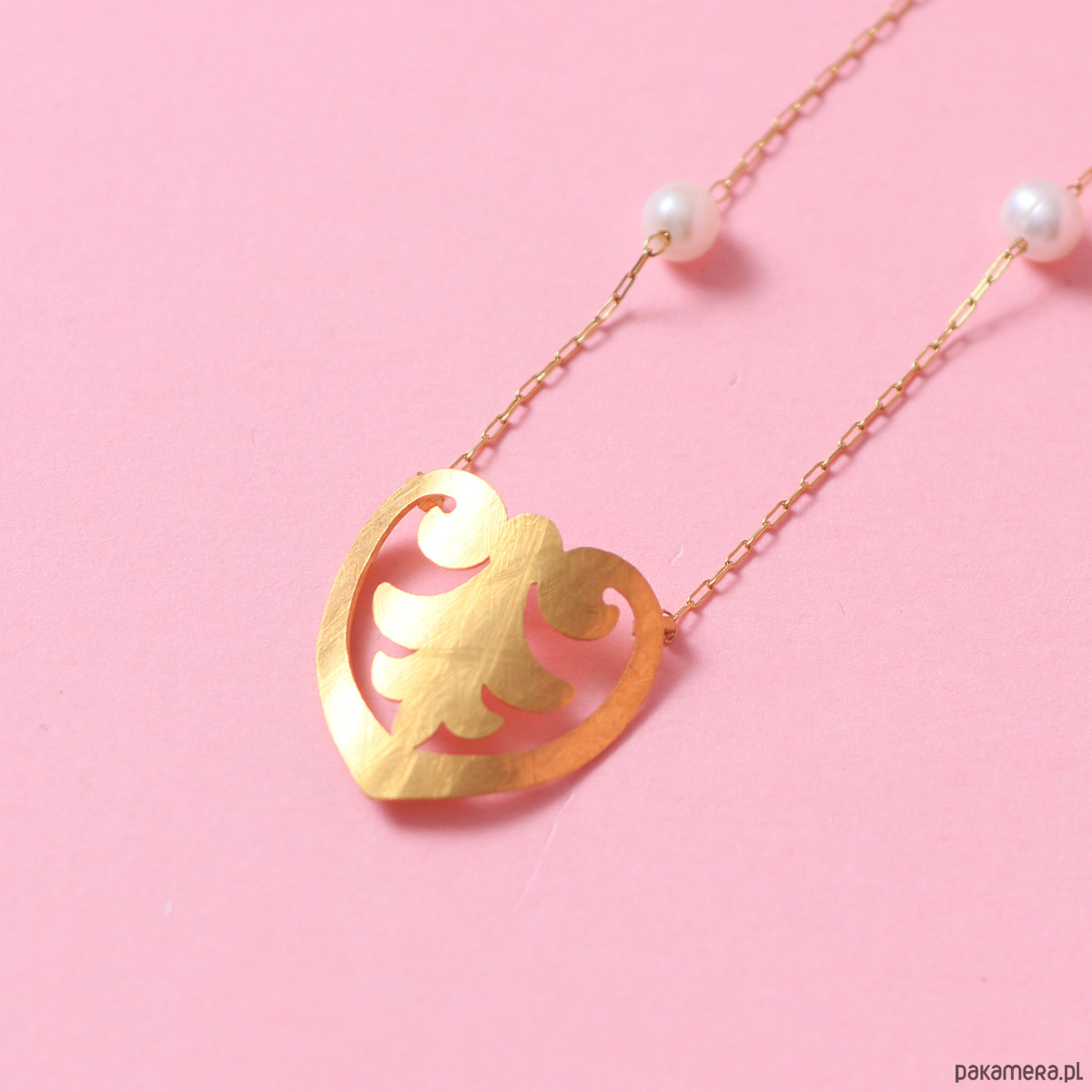 Serce o pełnym kształcie z ornamentem w środku ozdobiłam białymi perełkami. Wykonałam je z mosiądzu i po ręcznym nadaniu tekstury pozłociłam najprawdziwszym 24-karatowym złotem. Łańcuszek wykonany jest z najwyższej jakości stali szlachetnej pozłacanej - odporny na ścieranie i zerwanie.