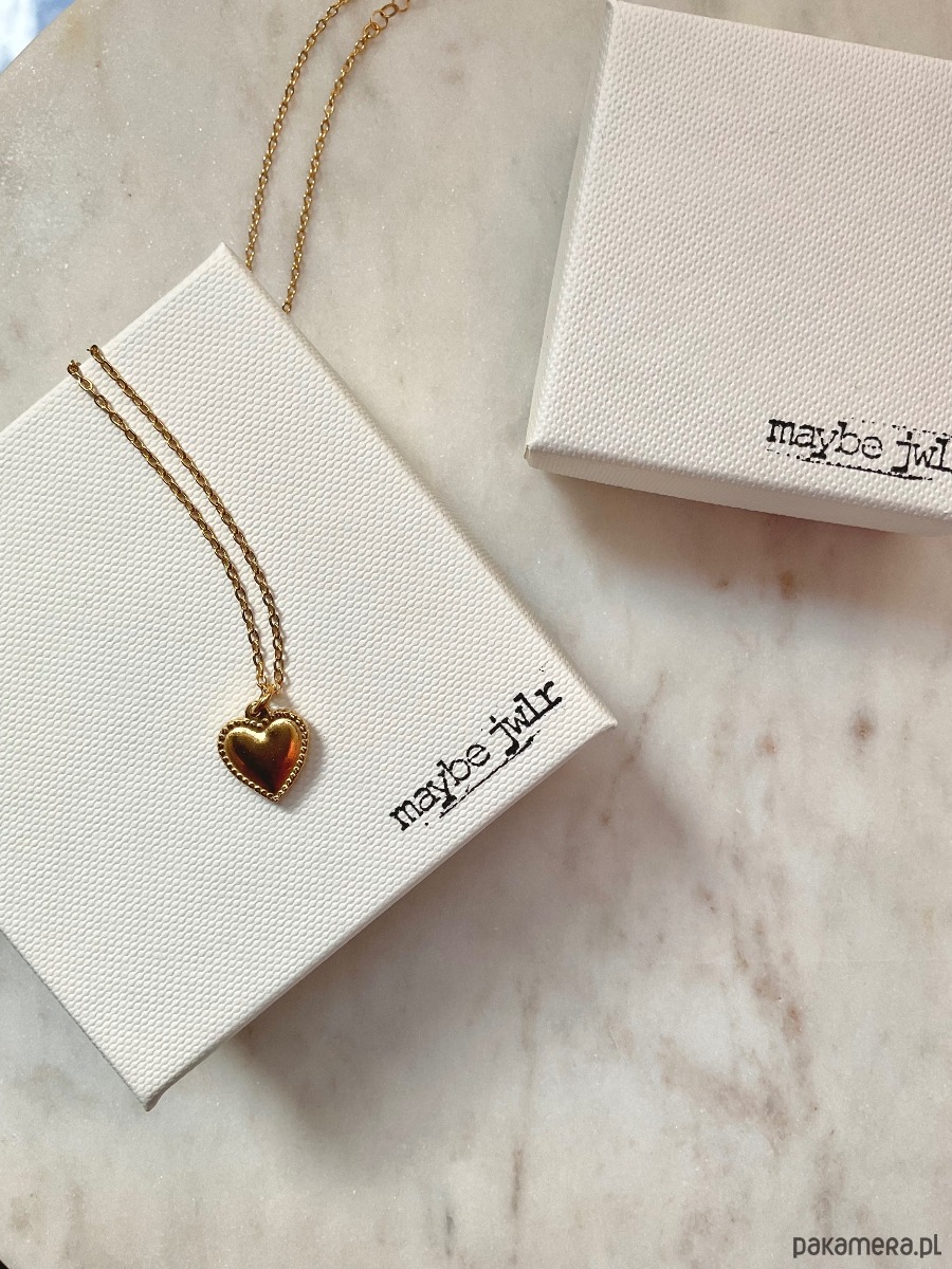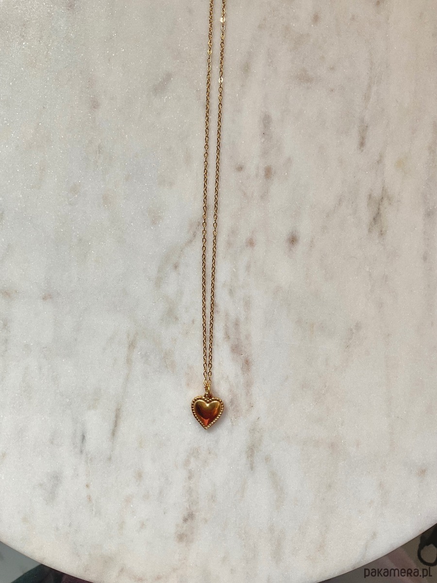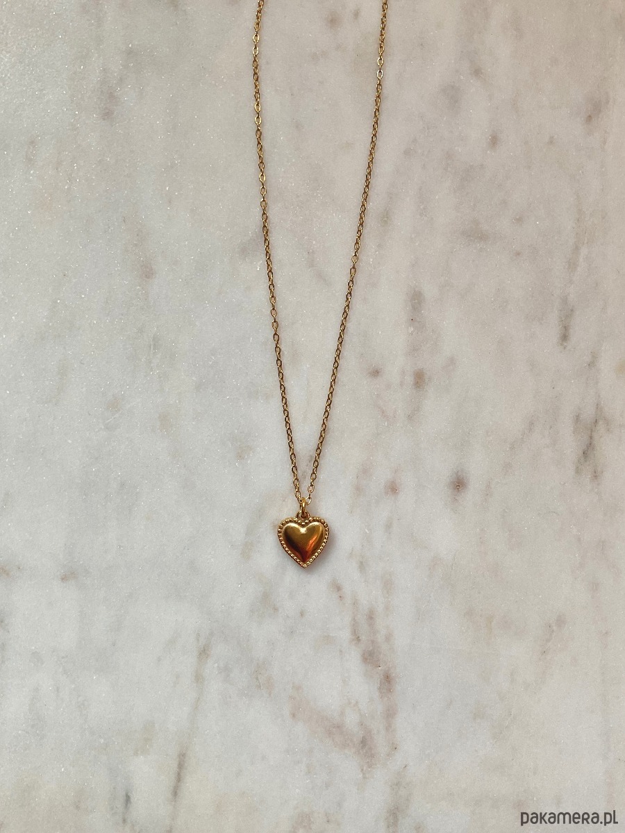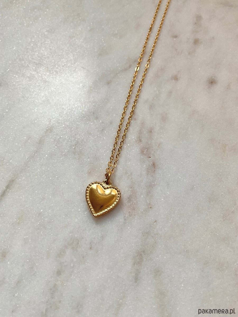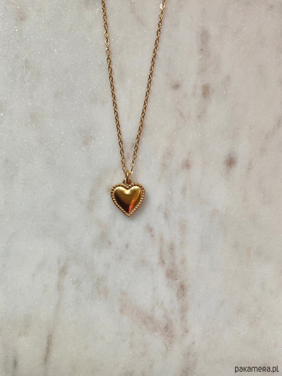 Naszyjnik kobiecy na delikatnym łańcuszku z zawieszką o kształcie serduszka. Całość wykonana jest ze stali szlachetnej z trwałym złoceniem.