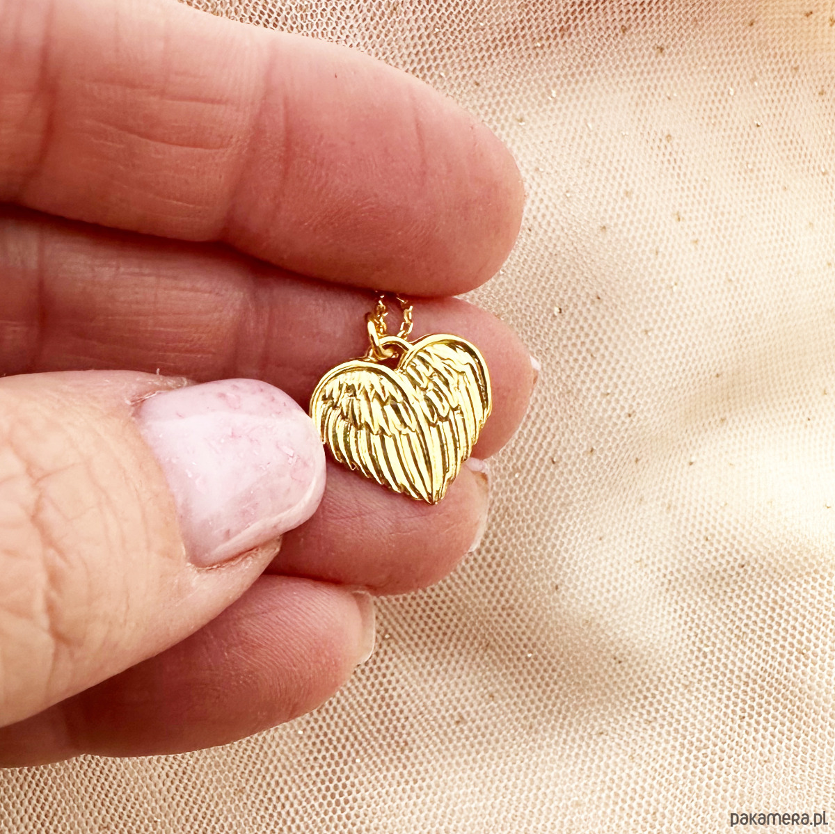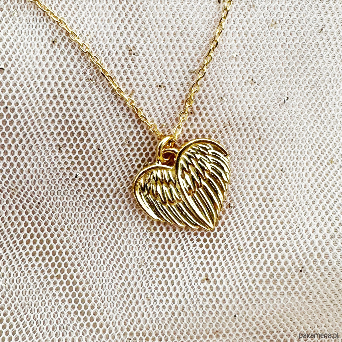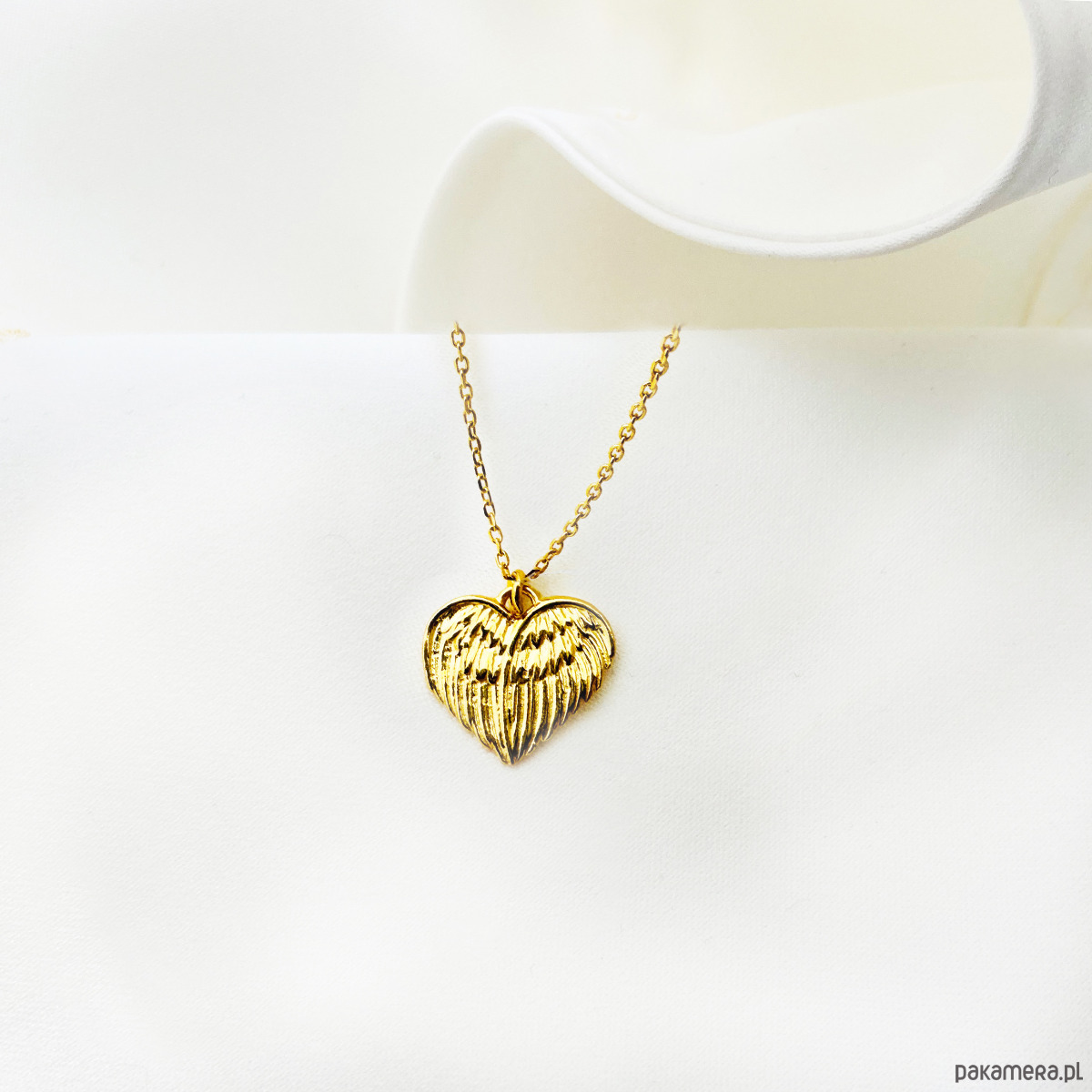 Oryginalny naszyjnik z wyjątkową zawieszką w kształcie serca, utworzoną z delikatnie ułożonych skrzydeł. Wykonany z wysokiej jakości srebra próby 925, pokrytego warstwą 24-karatowego złota. Subtelna forma i symboliczny motyw sprawiają, że naszyjnik doskonale podkreśla kobiecość i doda blasku każdej stylizacji — zarówno na co dzień, jak i na wyjątkowe okazje.