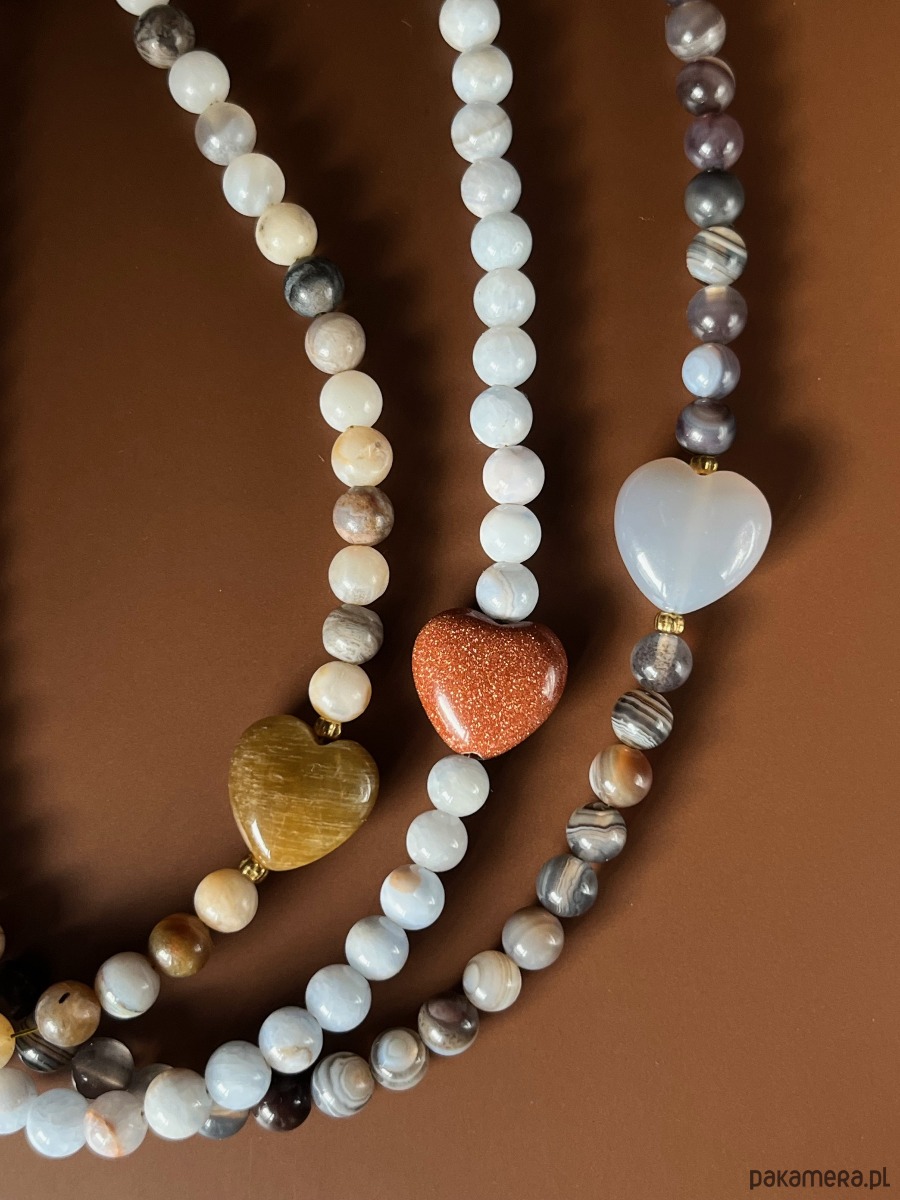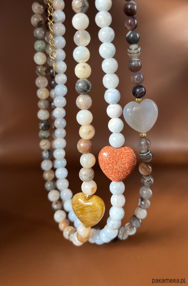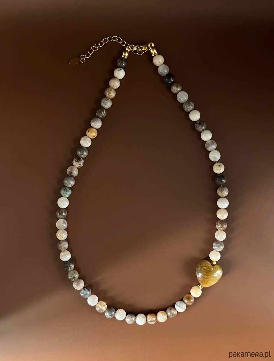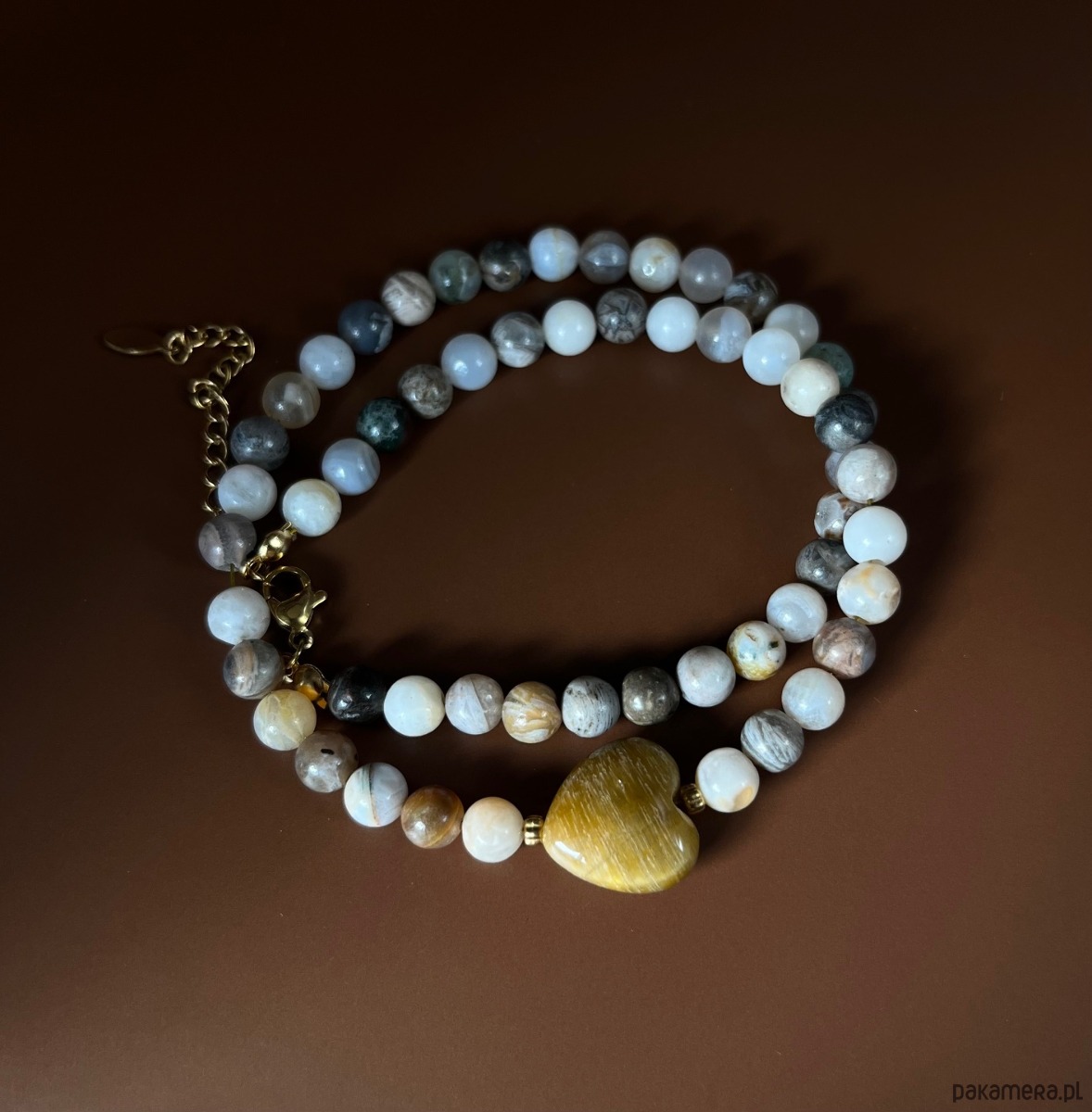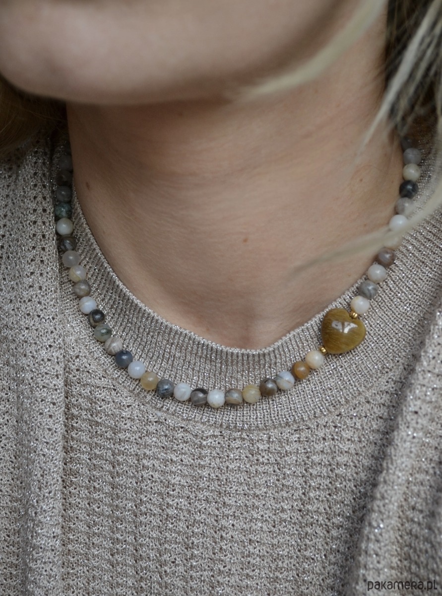Został wykonany z okrągłych beżowych i piaskowych koralików z agatu, serduszko to tygrysie oko w piaskowym odcieniu.