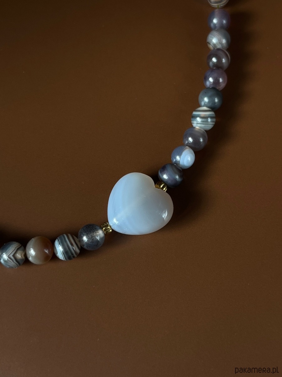 Został wykonany z okrągłych szaro-beżowych koralików z agatu (sardonyks), serduszko to agat w jasnoszarym odcieniu.