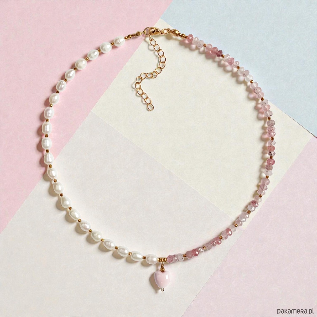 Naszyjnik z serduszkiem : perły, kwarc truskawkowy