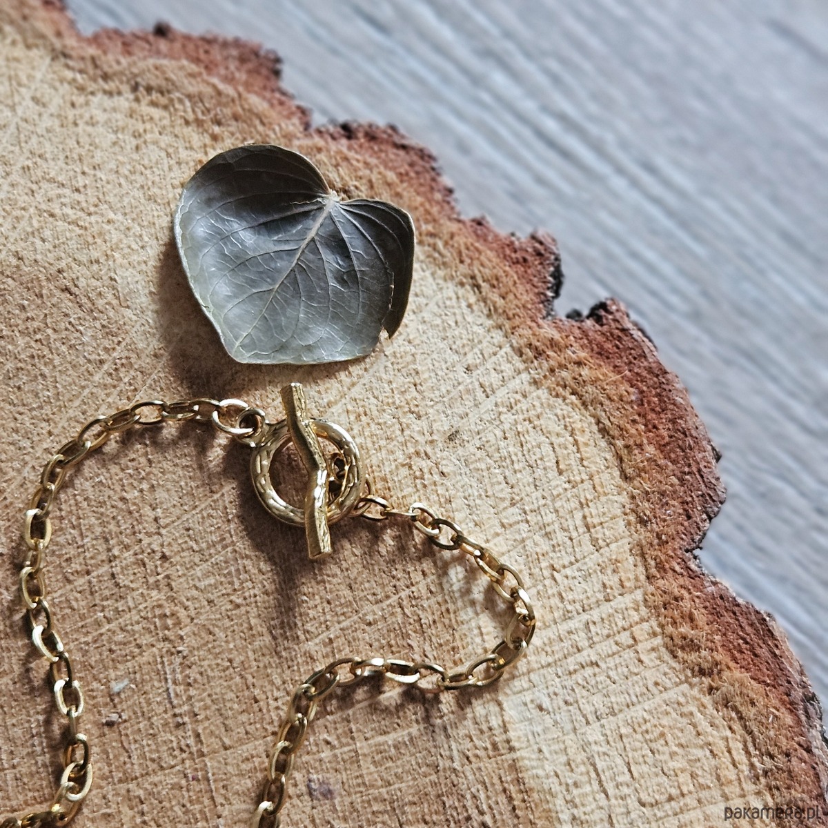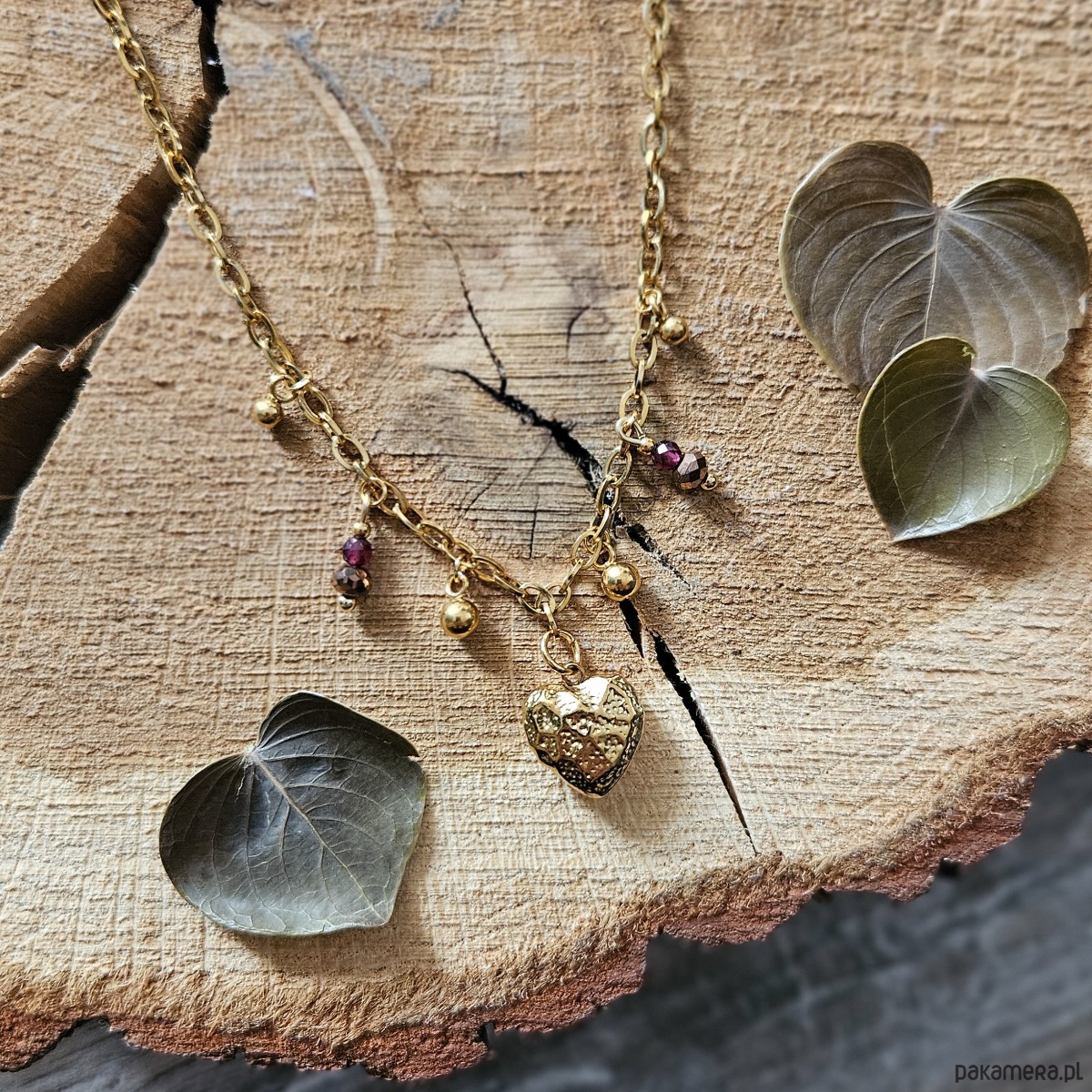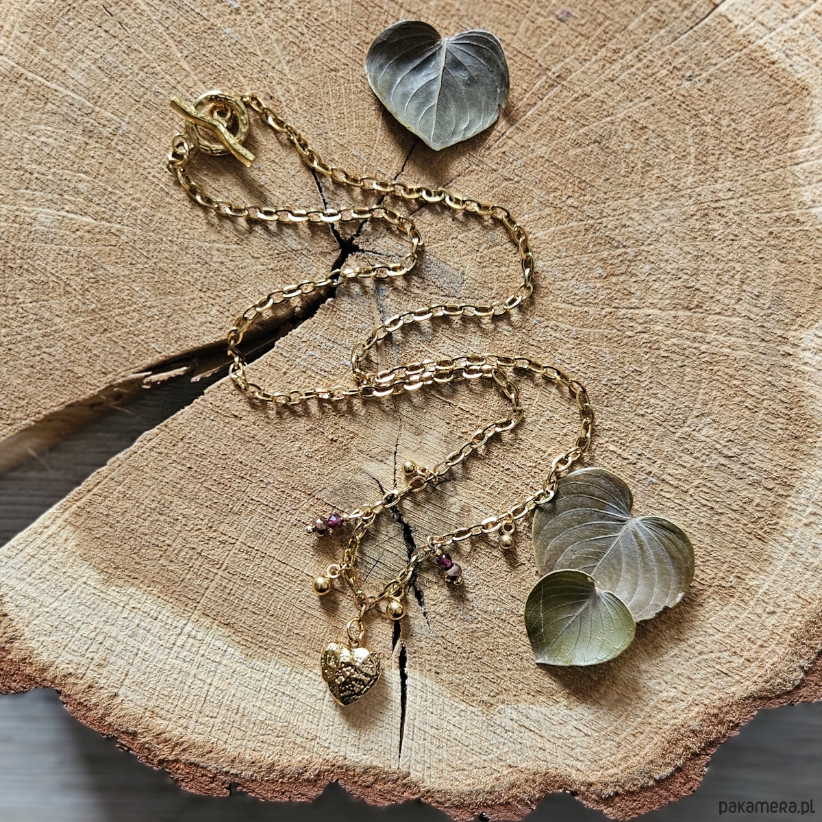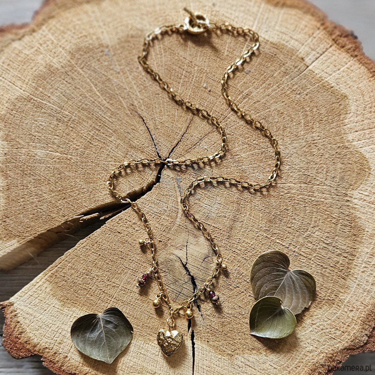 Naszyjnik, który może być pięknym wyznaniem miłości – dla kogoś lub siebie samej. W jego centrum znajdziesz trójwymiarową zawieszkę – serduszko o przepięknej, nieregularnej fakturze. Łańcuszek ozdobiony został kuleczkami ze stali szlachetnej oraz kamieniami naturalnymi. Miedziany hematyt subtelnie lśni, a granat przyciąga wzrok swoją głęboką barwą, przypominając o tym, że jest kamieniem symbolizującym miłość, pasję i zmysłowość. Całość uzupełnia modne zapięcie toggle, nawiązujące fakturą do wyjątkowego wzoru zawieszki.