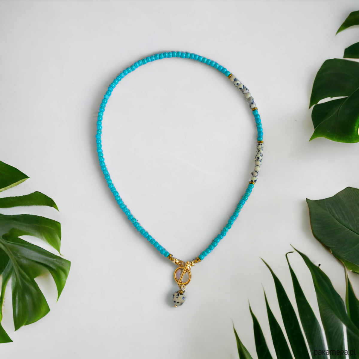 Wykonany z kuleczek jaspisu (ok. 4,5mm) i howlitu turkusowego, z dodatkiem złotego hematytu.