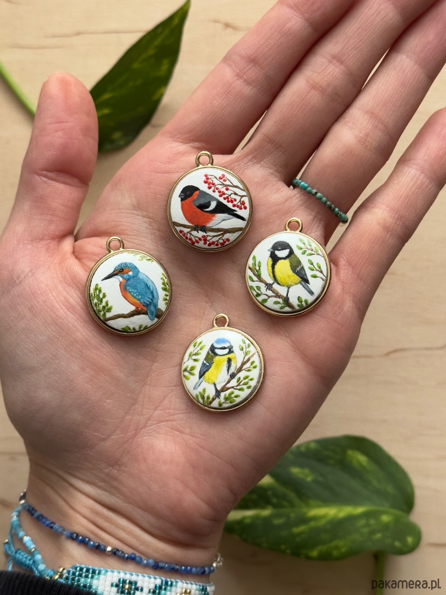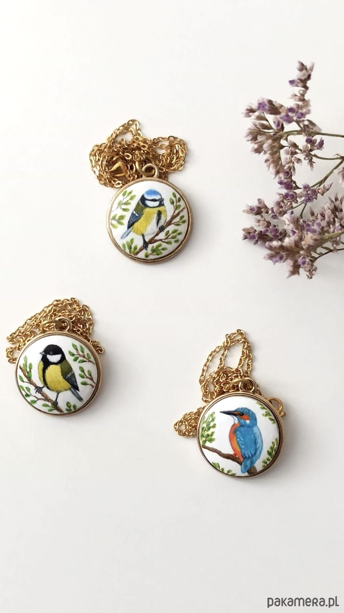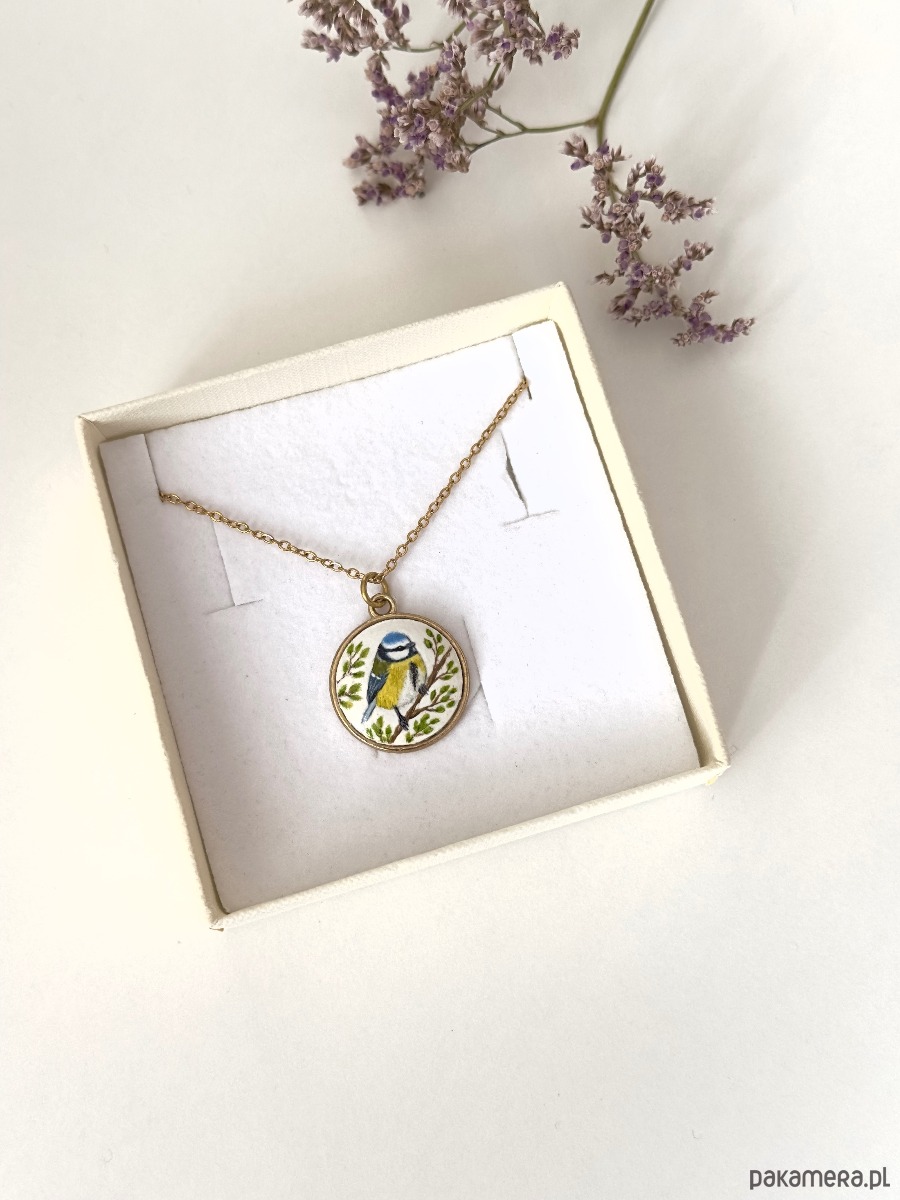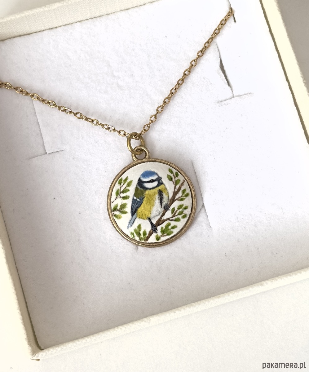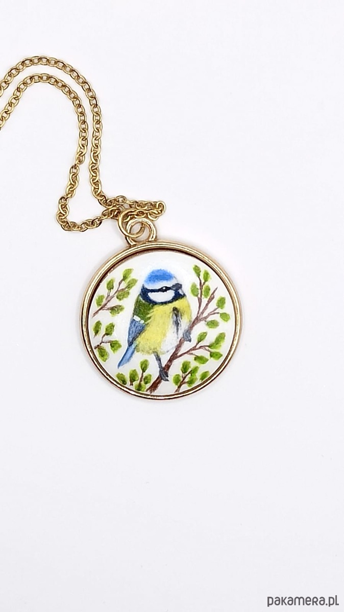 Naszyjnik ręcznie malowany z sikorką modraszką. Na antyalergicznej bazie metalowej, z łańcuszkiem ze stali szlachetnej o długości 45cm +przedluzka 5cm. Średnica wisiorka 2cm.