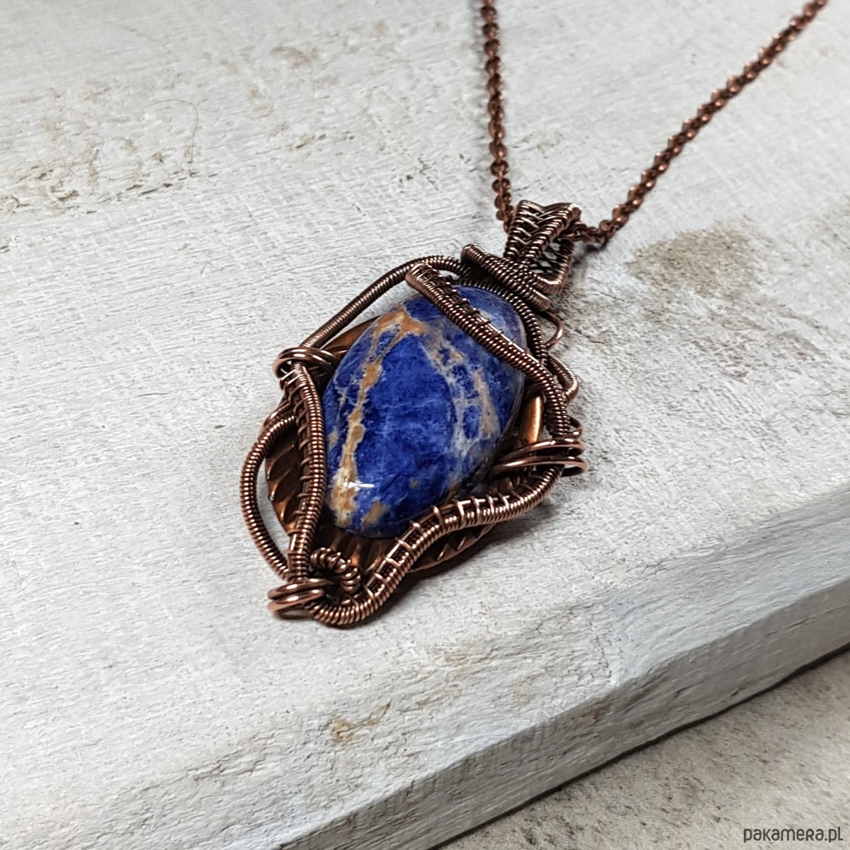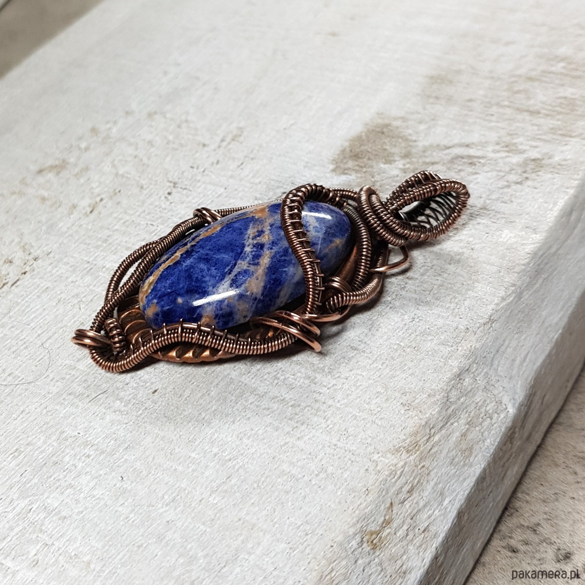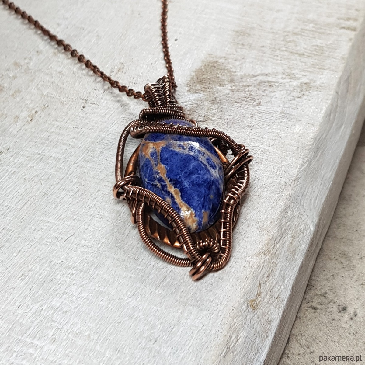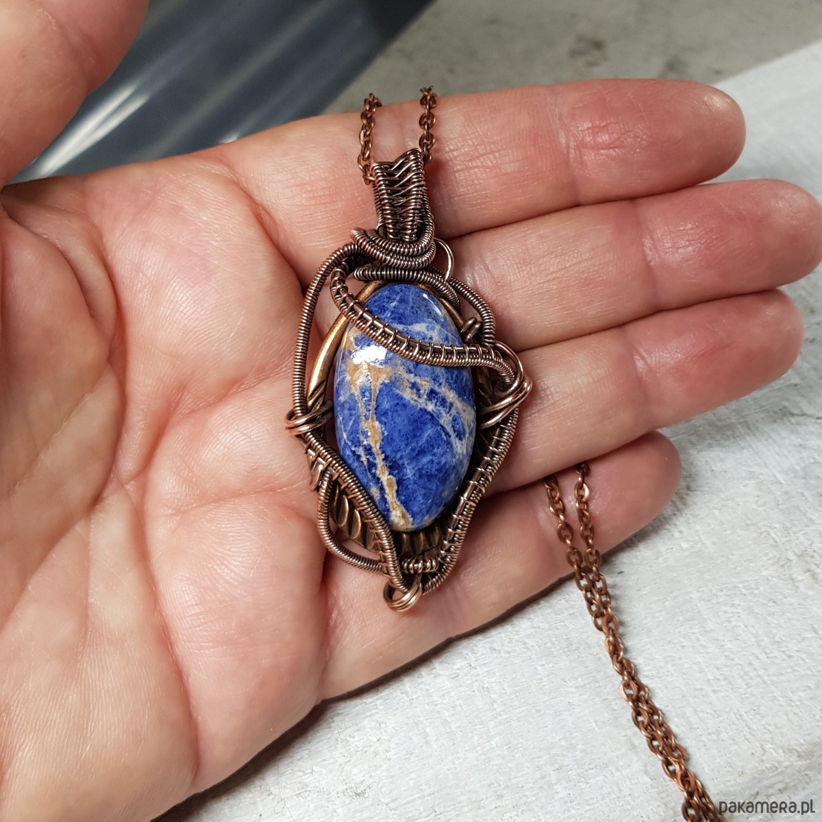 Wisiorek wykonany ręcznie w miedzi metodą wire-wrappingu z naturalnego minerału sodalitu, następnie oksydowany dla uzyskania szlachetnego efektu postarzenia i wypolerowany. Wymiary wisiorka z zawieszką 60x31mm, z łańcuszkiem o długości około 50 cm. Kamień jest bardzo ładny i zawieszka jest asymetryczna przez co daje wrażenie lekkości i nowoczesności.