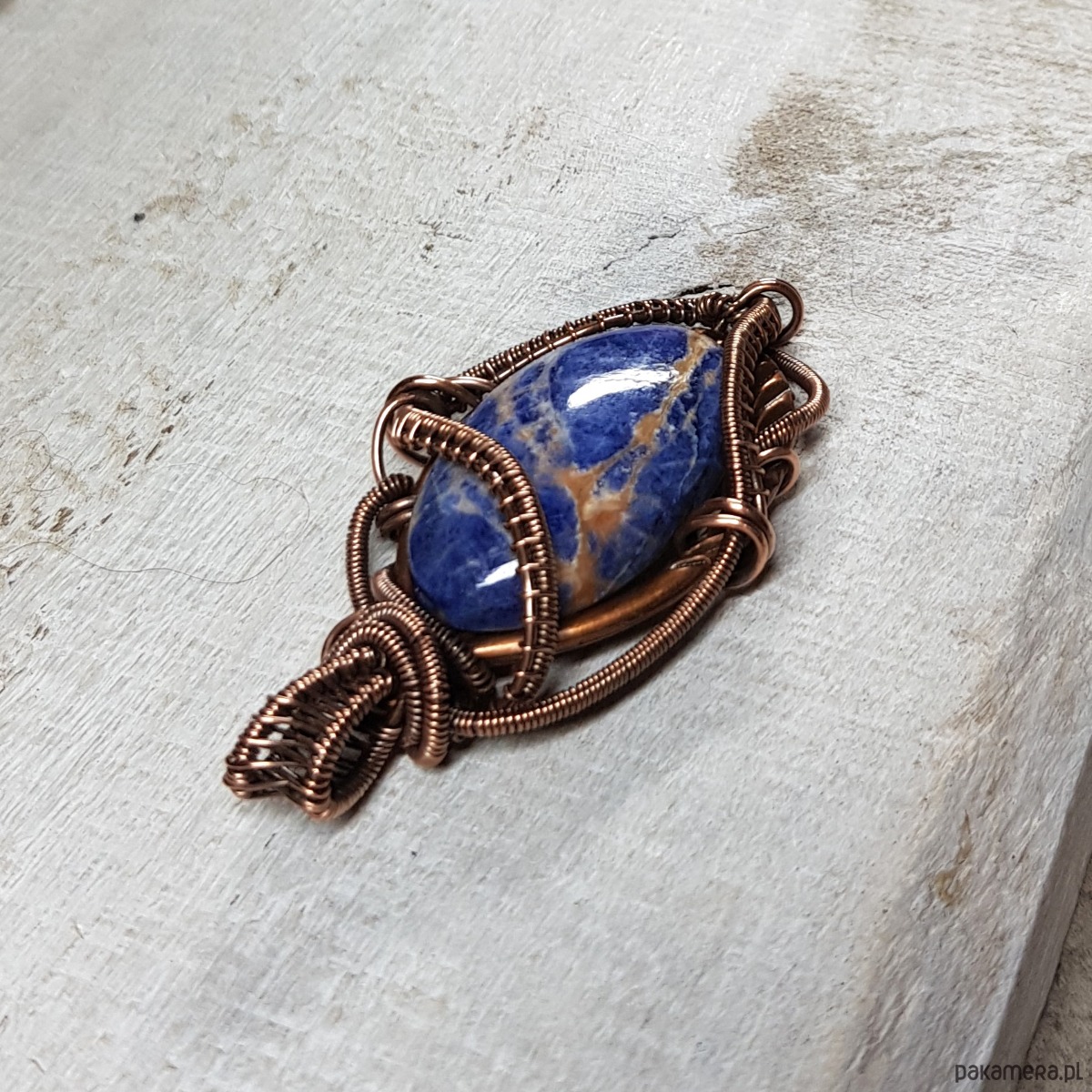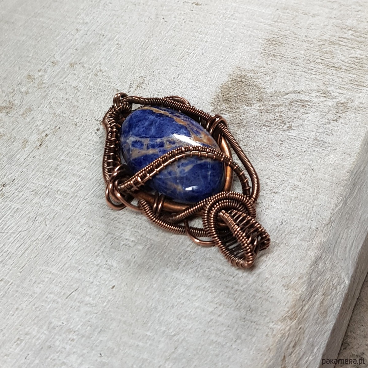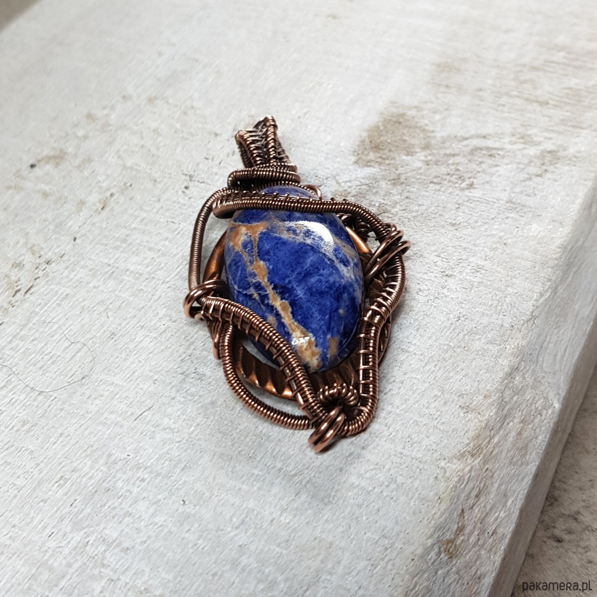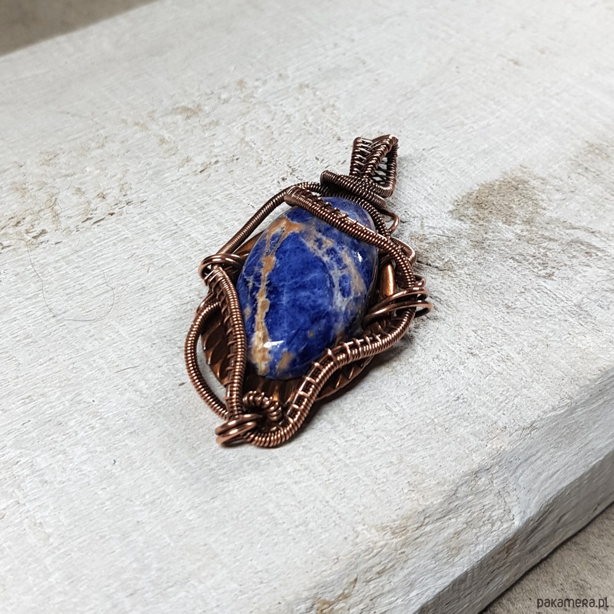 Wisiorek wykonany ręcznie w miedzi metodą wire-wrappingu z naturalnego minerału sodalitu, następnie oksydowany dla uzyskania szlachetnego efektu postarzenia i wypolerowany. Wymiary wisiorka z zawieszką 60x31mm, z łańcuszkiem o długości około 50 cm. Kamień jest bardzo ładny i zawieszka jest asymetryczna przez co daje wrażenie lekkości i nowoczesności.