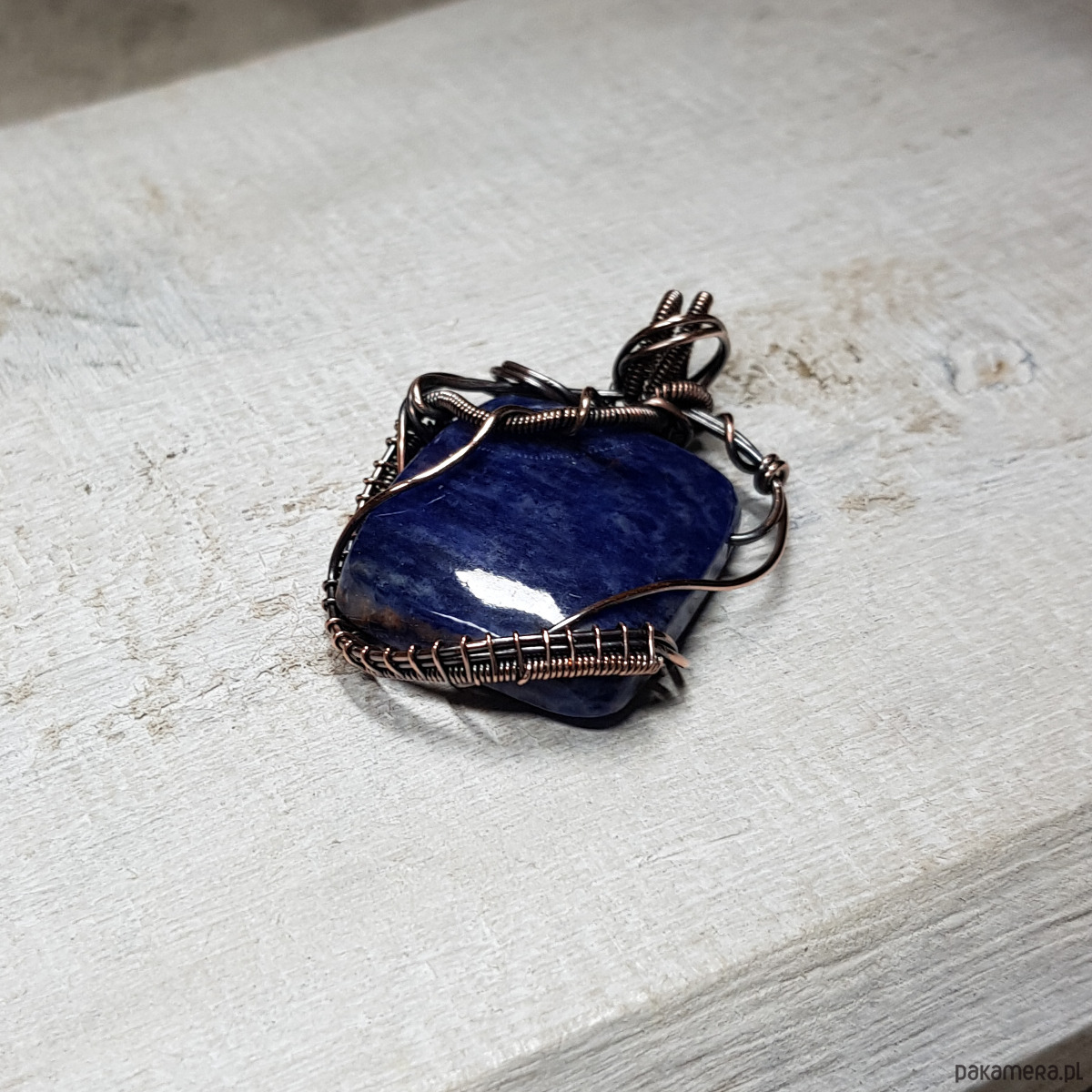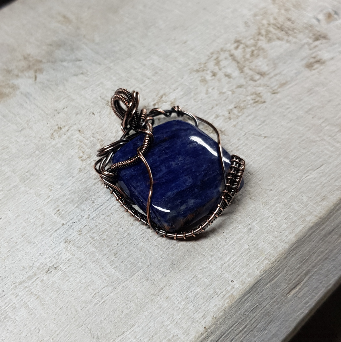Wisiorek wykonany ręcznie w miedzi metodą wire-wrappingu z naturalnego minerału sodalitu, następnie oksydowany dla uzyskania szlachetnego efektu postarzenia i wypolerowany. Wymiary wisiorka z zawieszką 43x33mm, z łańcuszkiem o długości około 45-50 cm. Kamień jest bardzo ładny i zawieszka jest asymetryczna przez co daje wrażenie lekkości i nowoczesności.