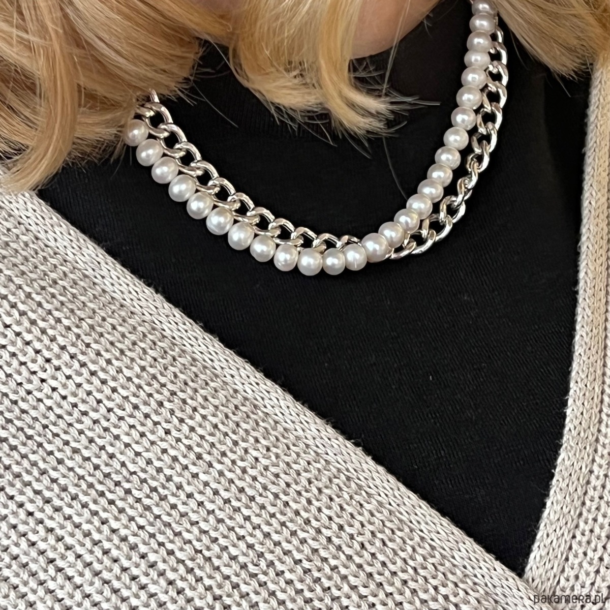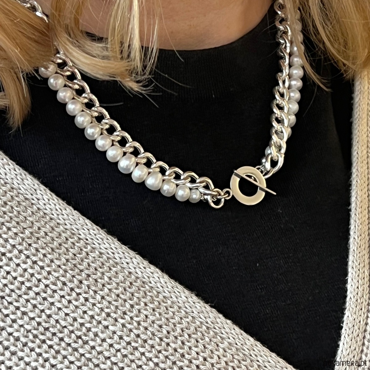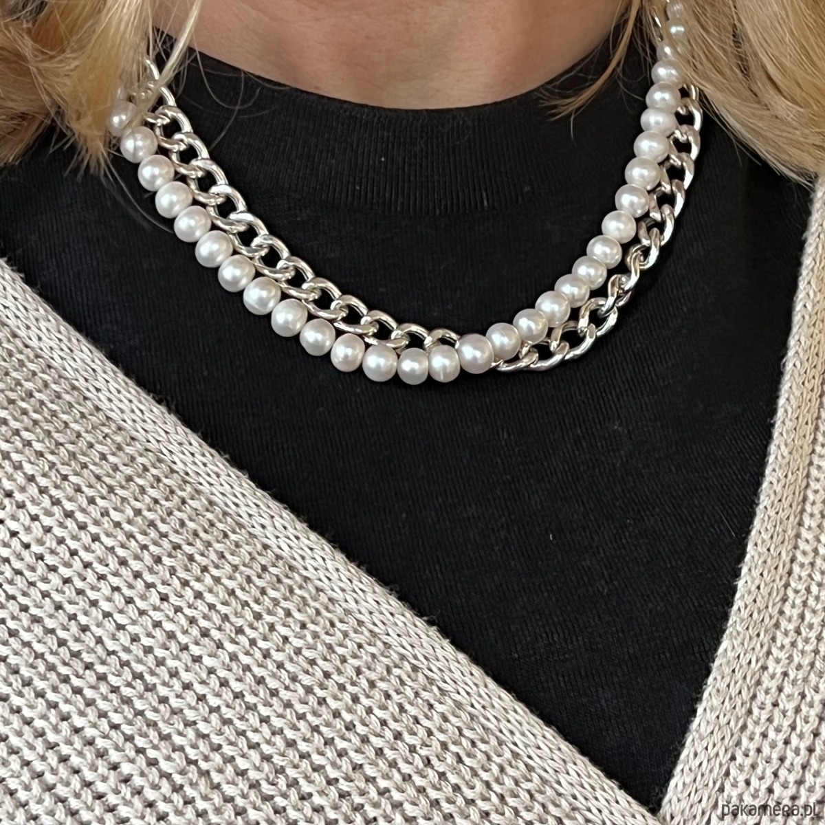 NASZYJNIK Z GRUBYM ŁAŃCUSZKIEM SREBRNYM I PERŁAMI - Styl CHANEL