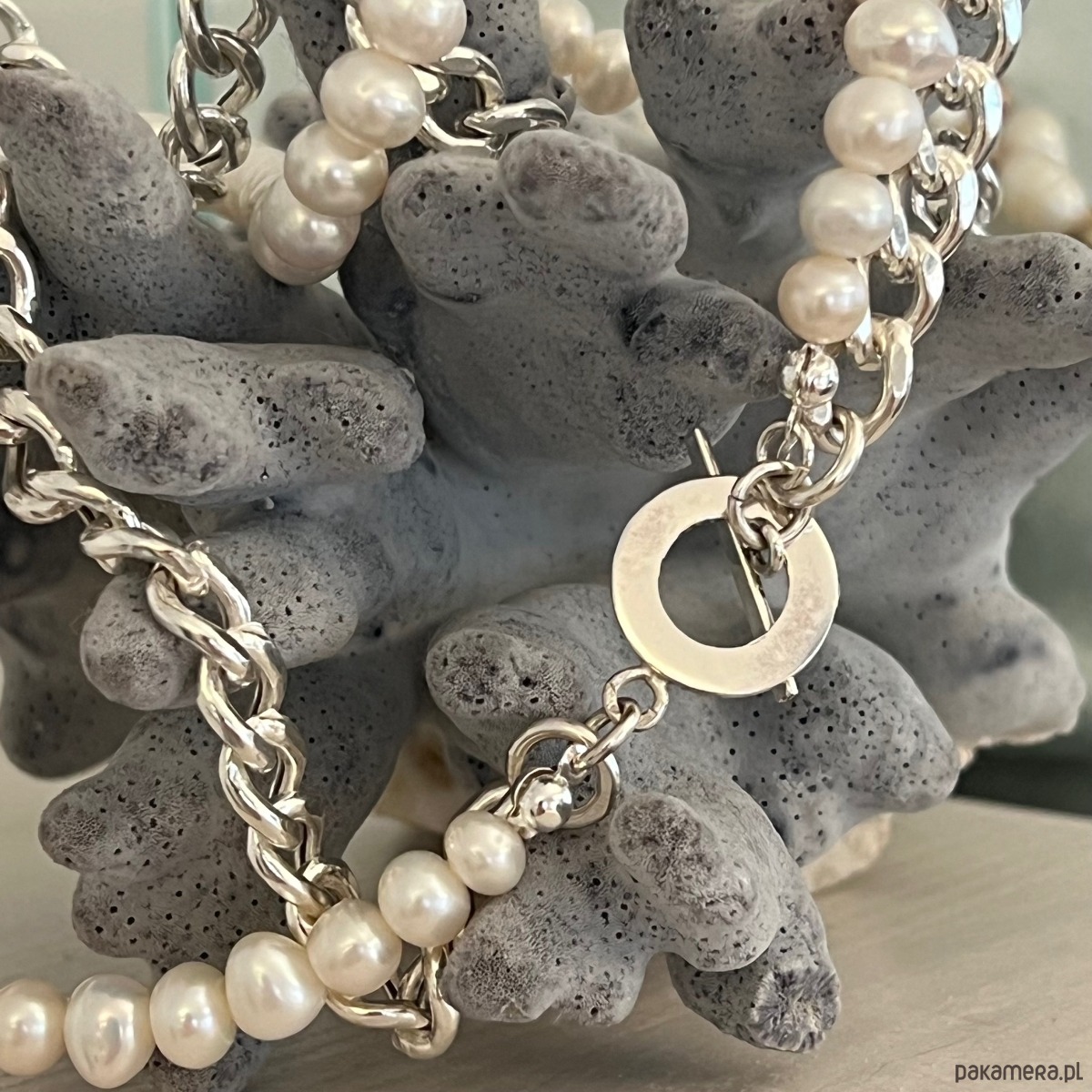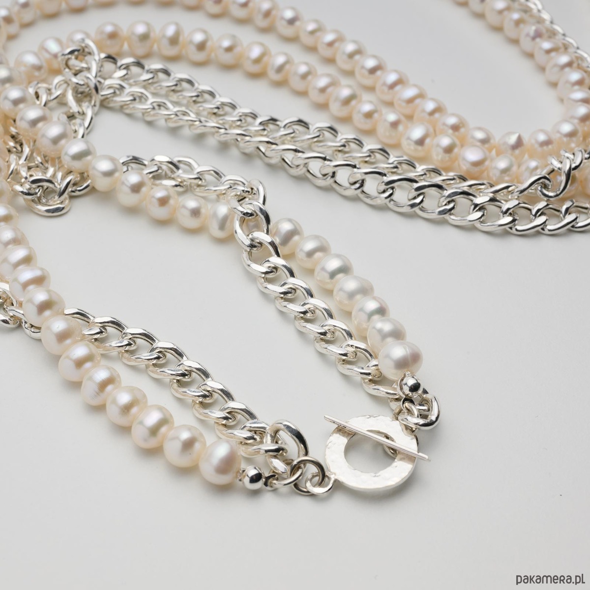 Naszyjnik ze srebra splata w sobie dwa światy, tworząc harmonijną opowieść o sile i delikatności. Pierwszy sznur, o klasycznym splocie pancerki, połyskuje chłodnym blaskiem metalu – stabilny, pewny, mocny jak linia, która prowadzi ku elegancji. Drugi sznur, utkany z białych pereł hodowlanych, przynosi miękkość i światło, jakby ocean zostawił na nim swój najczystszy oddech.